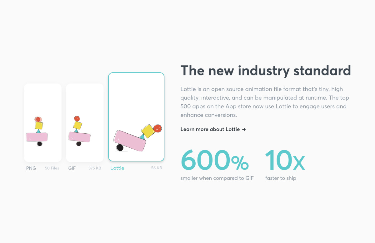 반면 Lottie는 After Effects를 활용하여 JSON파일로 변환하는 오픈 소스 텍스트 및 벡터 기반 파일 형식으로 해상도 대응이나 용량을 대폭 줄여서 적용 가능하기 때문에 GIF보다 매력적인 방법으로 많은 디자이너와 개발자들이 선호하고 있습니다.
