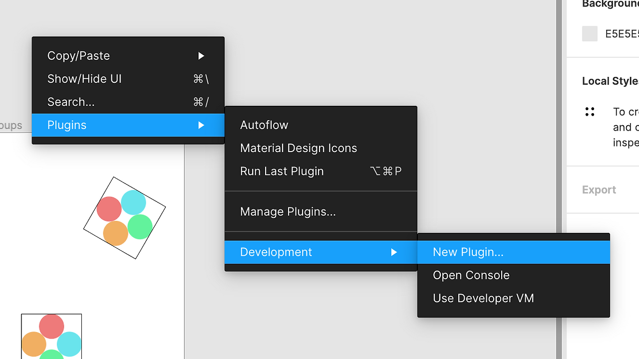 스케치와 마찬가지로 하단의 링크를 통해 파일을 다운로드하고 압축을 해제하면 AEUX Figma라는 파일이 있습니다. 다운을 받으신 후 피그마에서 마우스 오른쪽 클릭을 하여서 Plugins > Development > New Plugin을 클릭해줍니다.