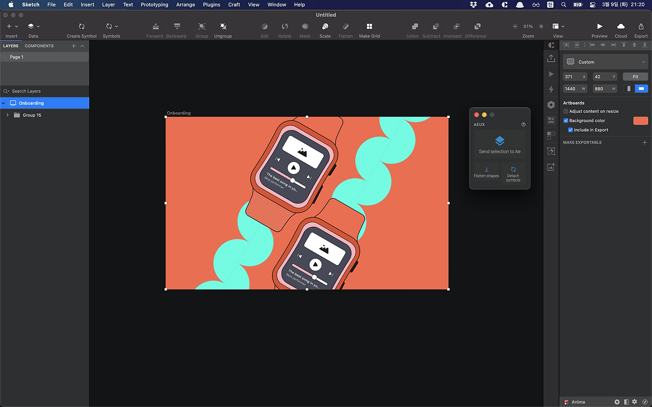 일단 스케치에서는 하단의 링크를 들어가 버전에 맞게 다운로드하신 후 압축을 해제하면 스케치 파일의 플러그인이 보입니다. 설치해주시면 바로 스케치에 플러그인이 추가되며 실행시키시면 AEUX창이 뜨게 되는데 아트보드를 선택 후 Send selection to AE를 클릭하시면 됩니다.