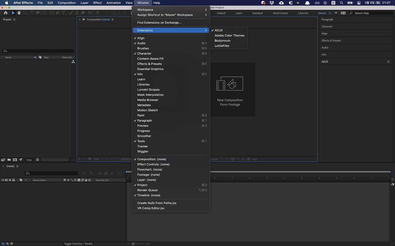 그다음 ZXP파일을 ZXP Installer에 드래그 앤 드롭하시고 난 후 After Effects를 실행하고 Window > Extensions 창에 들어가면 LottieFiles가 설치되어 있는 화면을 볼 수 있습니다.