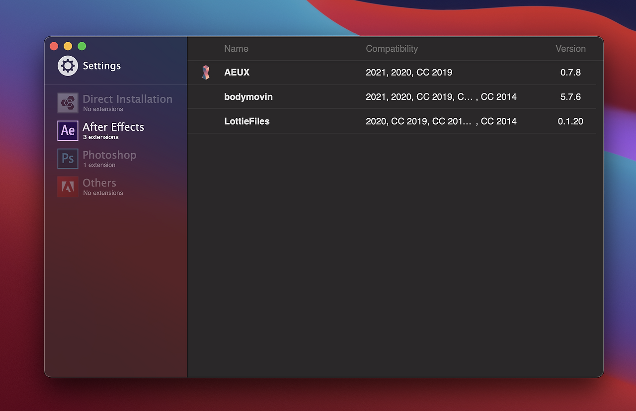 툴이 모두 준비되었다면 각 툴들을 연결하거나 JSON파일을 추출해줄 플러그인들이 필요합니다. After Effects에서 필요한 플러그인은 Lottie나 Bodymovin이 필요하며 Illustartor를 사용하면 같은 Adobe툴이기 때문에 리소스를 바로 가져올 수 있어서 두 개의 플러그인만 필요하지만 Sketch나 Figma를 사용한다면 After Effects에 연결해줄 AEUX 플러그인이 필요합니다. 툴 설치는 매우 간단하지만 플러그인 설치방법은 간단하지 않아서 플러그인 설치 방법을 알려드립니다.