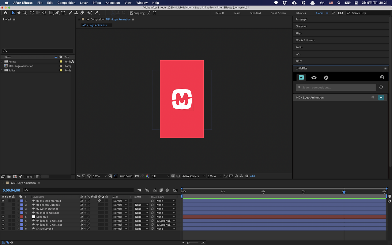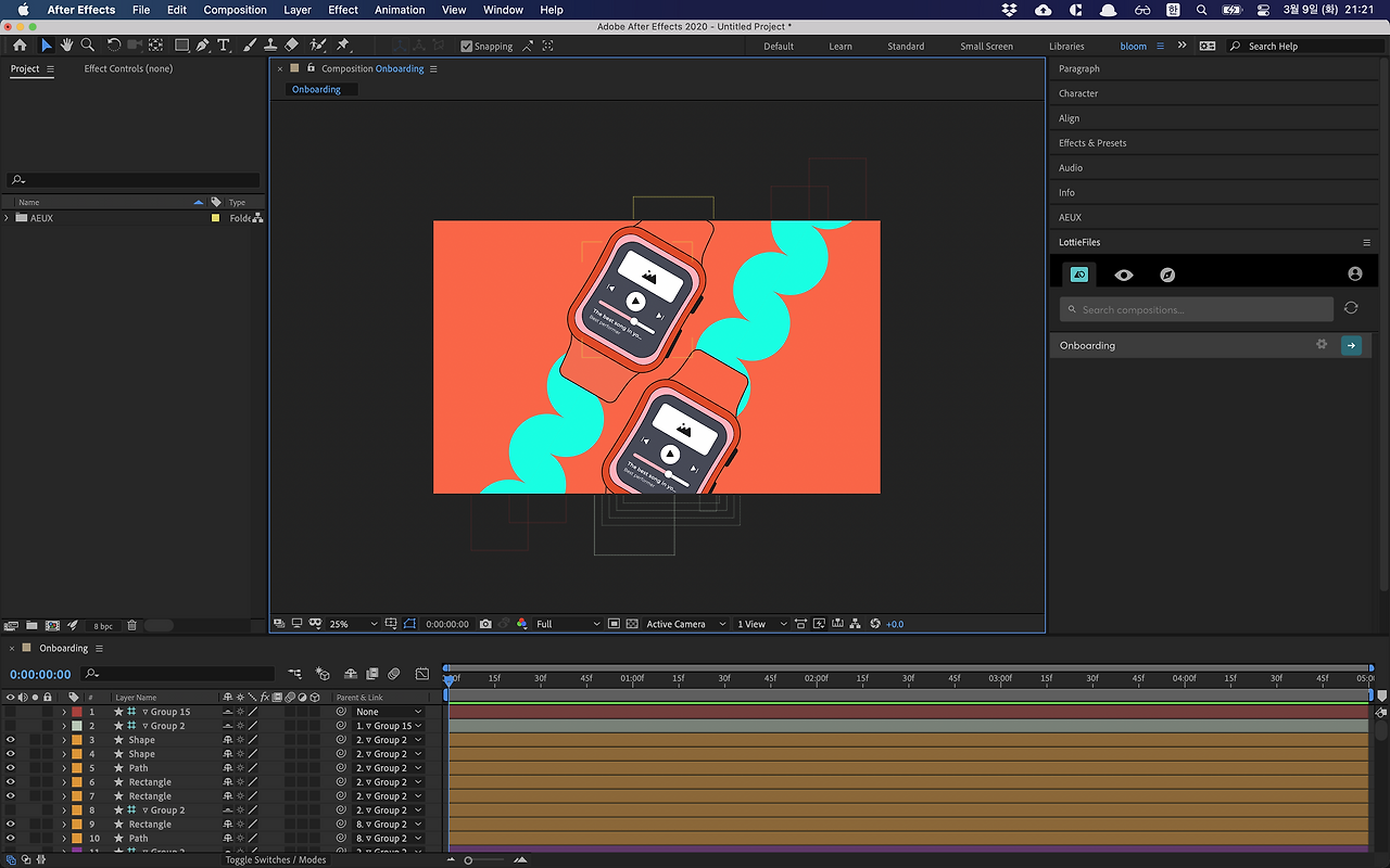 그러면 After Effects에서 AEUX라는 폴더에 컴포지션이 추가되며 에셋들도 모두 삽입된 상태로 넘어오게 되며 손쉽게 스케치 파일을 에펙에서 작업하시면 됩니다.