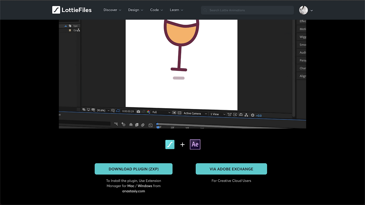 일단 하단의 첨부해드린 링크에서 Lottiefiles를 들어가서 Adobe Creative Cloud 유저라면 VIA ADOBE EXCHANGE를 클릭하시면 쉽게 설치가 가능하며 클라우드 유저가 아니라면 Download Plugin(ZXP) 파일을 설치해줍니다.