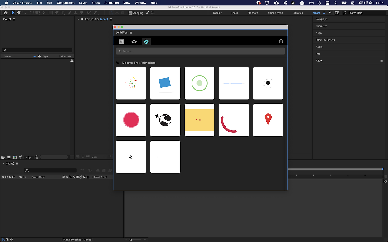 LottieFiles 플러그인은 기존의 Bodymovin보다 기능 구현을 더 빠르고 효율적으로 미리 보기 해주며 플러그인창에서 애니메이션을 검색하고 AE파일을 다운로드할 수 있으며 자신의 대시보드에 있는 애니메이션을 볼 수 있기 때문입니다.