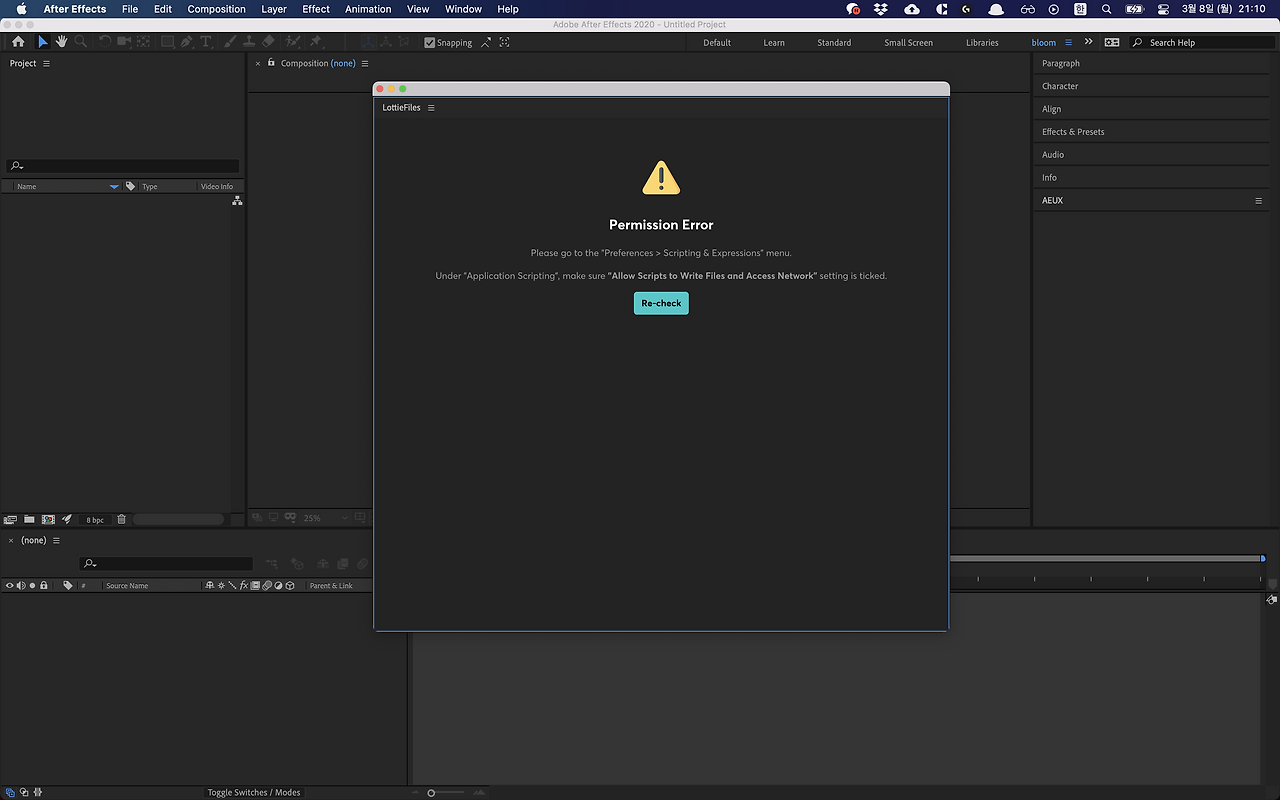 분명 아무런 설정을 하지 않은 After Effects에서 LottieFiles를 실행하면 위와 같은 에러 파일이 뜰 것입니다. 그러면 당황하지 않고 Preferences > Scripting & Expressions에서 Allow Scripts to Write Files and Access Network를 체크해줍니다. 또한 영문으로 설정해줘야 한다는 이야기도 있으니 After Effects를 영문판으로 설치를 권장드립니다.