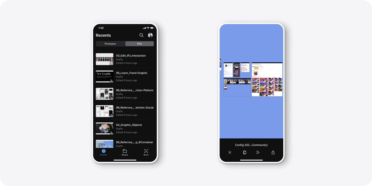 기존에 피그마 모바일앱은 단순히 미러용으로 사용하였는데 베타 버전을 받아서 직접 사용해보니 이제는 디자인 파일을 직접 볼 수 있으며 컴퓨터 없이도 프로토타입을 재생할 수 있고 파일과 프로토타입을 모바일앱으로 여러 사람들한테 공유 링크를 보낼 수 있습니다.
