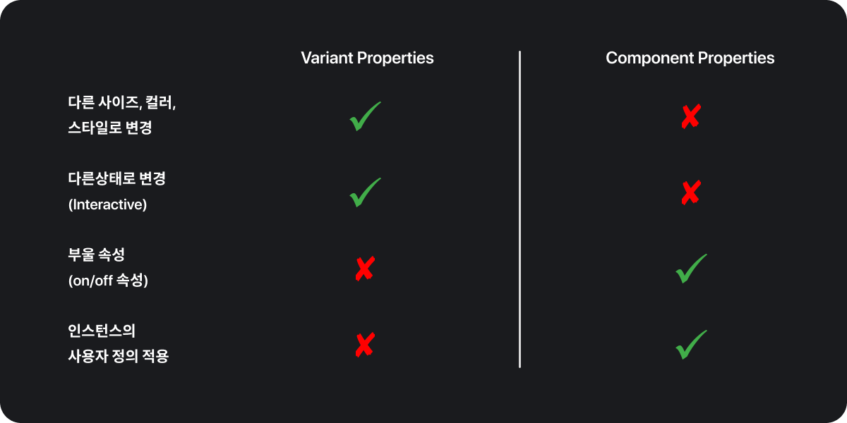 Variant Properties와 Component Properties는 어떤 차이가 있냐 하면 크게는 Interactive Animation을 구현 유무와 다른 사이즈, 컬러, 스타일로 변경유무 등이 있는데 이런 사항은 위의 표를 참고 부탁드립니다. 저는 Primary와 Secondary의 구분은 Variant Properties를 활용하여 Interactive도 사용할 수 있게 설정을 하고 아이콘의 On/Off 기능은 Component Propertie 기능을 활용하는 것을 괜찮지 않을까 생각합니다.