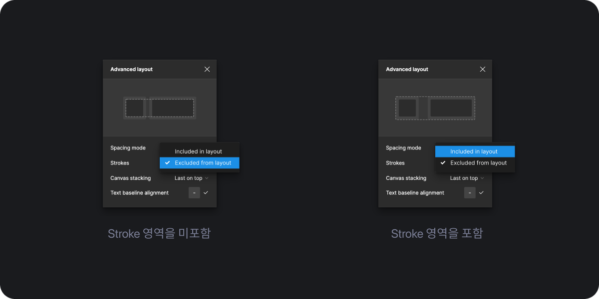 이 기능은 Hand off에서 유용한 기능입니다. 테두리 값을 프레임의 영역에 넣을 것인가 아니면 포함하지 않을 것인가를 설정하는 기능입니다. 이 기능이 없었을 때는 수동으로 프레임을 스트로크를 제외한 영역으로 설정하여 영역을 잡고 만약 프레임에 다른 요소가 추가되면 영역을 재설정하는 번거로움이 있었는데 이러한 불편함이 해소되는 기능이었습니다.