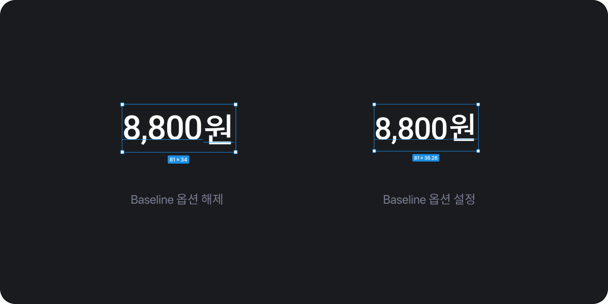 위의 이미지처럼 숫자는 Roboto 텍스트는 Noto Sans의 경우에 Auto Layout 설정을 하게 되면 텍스트 정렬이 맞지 않아서 텍스트의 높이를 수동으로 수정하거나 프레임을 씌워야 했지만 이제는 Baseline 정렬 옵션을 통해 이와 같은 문제를 해결할 수 있습니다.