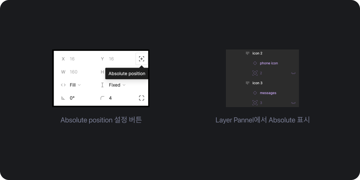 Absolute를 설정하는 방법으로는 우측의 Position Panel에서 Absolute position 버튼을 클릭하게 되면 설정이 적용되며 해당 기능이 설정된 요소는 Layer Panel에서 다른 아이콘 모형으로 표시됩니다. 그리고 Absolute 설정을 하게 되면 자연스럽게 부모 속성의 크기에 따라서 위치가 이동하므로 해당 요소의 핀 위치를 정확하게 설정해야 합니다.