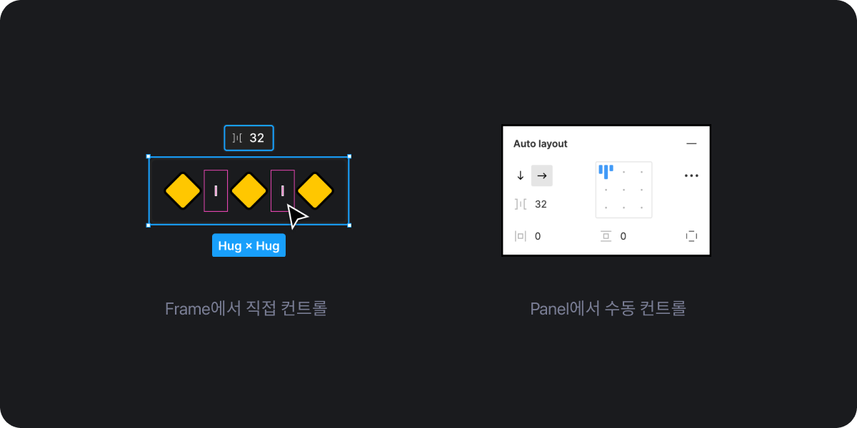 사실 이전에 Auto Layout Panel에서 값을 설정하는 것도 그렇게 불편하다고 생각하지 않았는데 이번 업데이트로 더욱 간편하고 빠르게 값을 설정할 수 있도록 변경되었습니다. 단축키를 통하여 설정하거나 프레임에서 직접 간격을 설정할 수 있으며 기존과 같이 패널에서도 직접 수정이 가능하여 더욱 빠르게 Auto Layout을 설정할 수 있습니다.