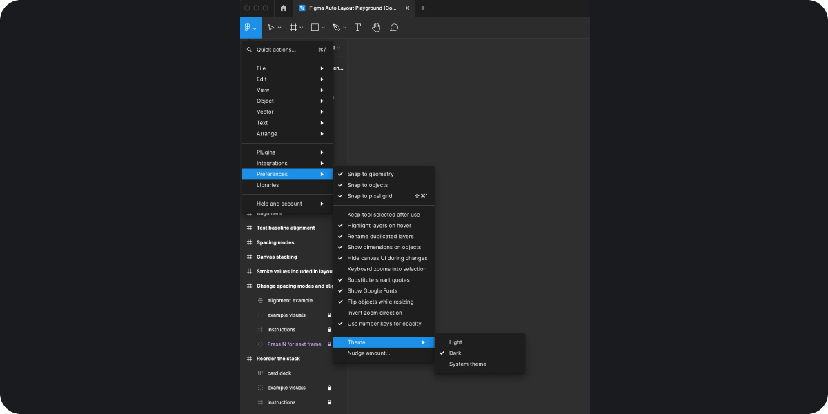 컨퍼런스 업데이트 팝업에서 바로 다크 모드를 적용할 수 있지만 그냥 지나치신 분들은 위의 Figma Menu → Preferences → Theme에 들어가셔서 원하는 설정으로 변경하실 수 있으니 다크 모드를 체험해보시고 싶은 분은 해당 경로를 통해서 테마를 설정하시기 바랍니다.