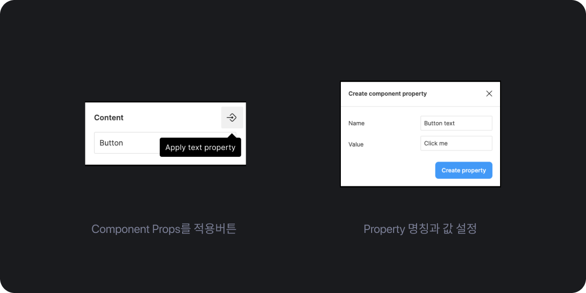 Component Properties는 가변으로 설정하고 싶은 요소의 Apply Property 버튼을 클릭하고 이름과 값을 설정해주면 Property Pannel에서 드롭다운이나 토글 또는 텍스트를 직접 입력하여 변경할 수 있습니다. 그리고 기존처럼 프레임에서 직접 눈을 끄거나 텍스트를 입력할 수도 있습니다.