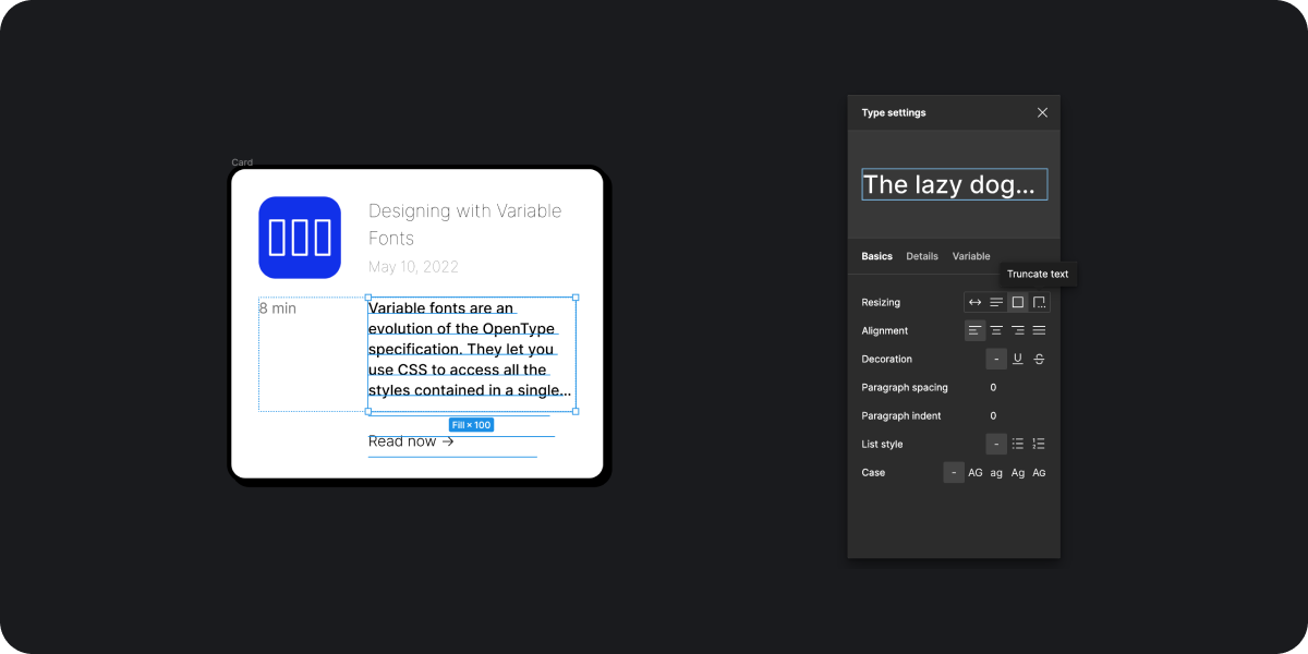 영상에서는 소개되지 않았지만 텍스트 박스 유형에서 지정한 사이즈를 넘어가면 말줄임표로 구현되는 기능도 새롭게 생겼습니다. 기존에는 프레임에 씌워서 Clip content 옵션을 설정해야 했는데 이제는 굳이 프레임을 씌우지 않고도 텍스트를 영역 안에서만 표시할 수 있어 매우 편리한 기능 중 하나라 생각하였습니다.