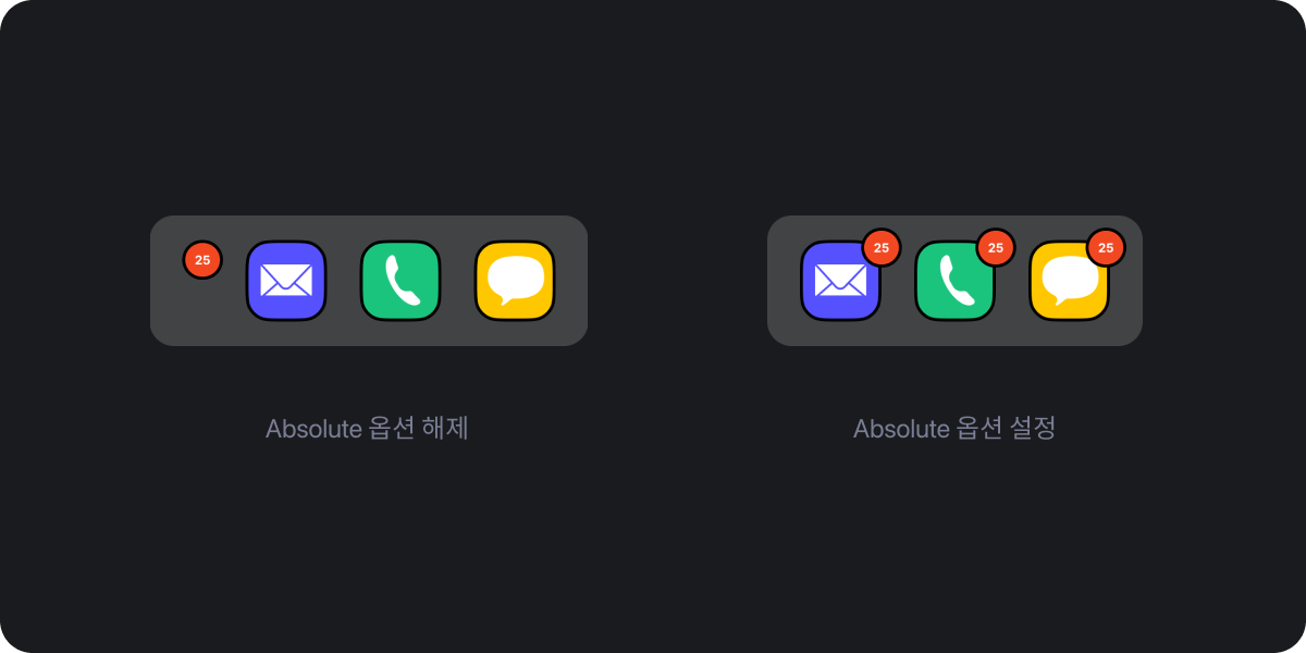 아이콘 위에 카운트 배지나 뉴 배지를 올릴 때 이러한 CSS가 주로 사용되는데 이런 기능을 그대로 피그마에 적용한 것입니다. 위의 이미지처럼 Auto Layout으로 설정된 프레임에 배지 요소를 추가하면 Padding 값이 그대로 적용되어 자유로운 이동을 위해서 프레임을 한 겹 더 씌워서 설정해야 했지만 이제는 Absolute 설정만으로 해결이 가능합니다.