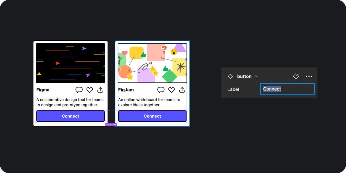 위의 이미지와 같이 두 개의 버튼 컴포넌트 내의 텍스트를 변경할 때 프레임 내에서 변경하면 일일이 바꿔야 하지만 변경할 요소들을 모두 선택하고 패널에서 변경을 하면 모든 요소를 동시에 변경이 가능합니다.