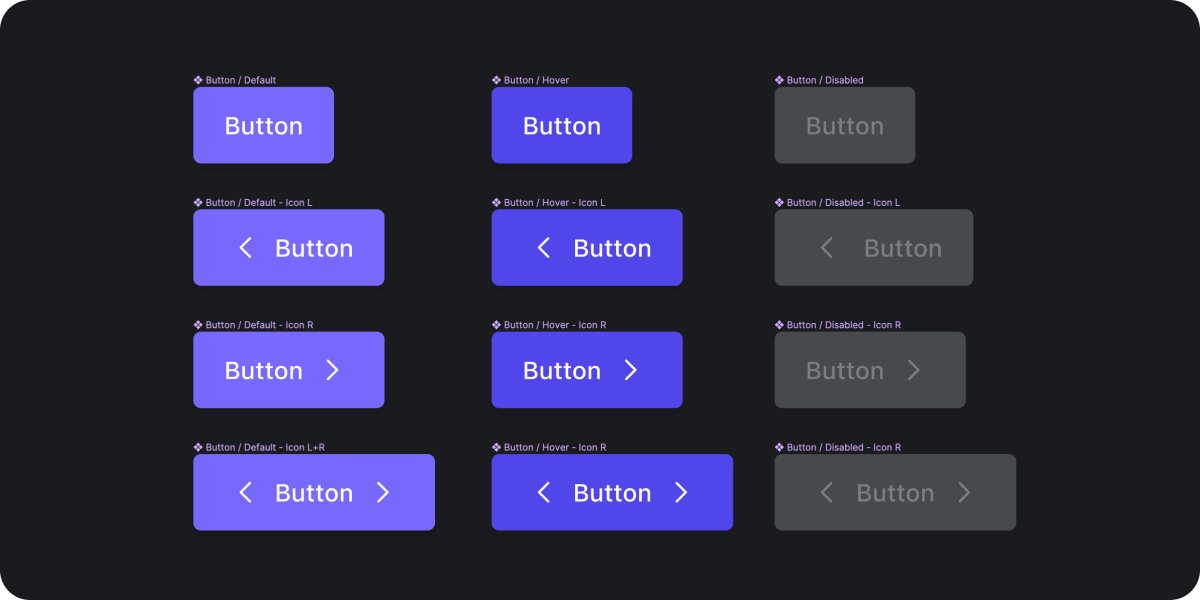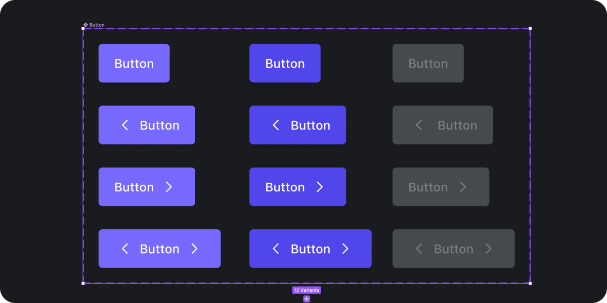 피그마는 이런 불편함을 해결하기 위해 2021년에 Variants라는 기능을 발표하였습니다. 무수히 많은 유형의 버튼들을 하나의 컴포넌트로 만들고 그 안에 옵션을 추가하여 속성들을 간편하게 제어하는 기능이었습니다. 이 기능은 컴포넌트의 네이밍을 줄일 수 있었고 보기 쉽게 그룹화할 수 있다는 장점이 있었습니다.