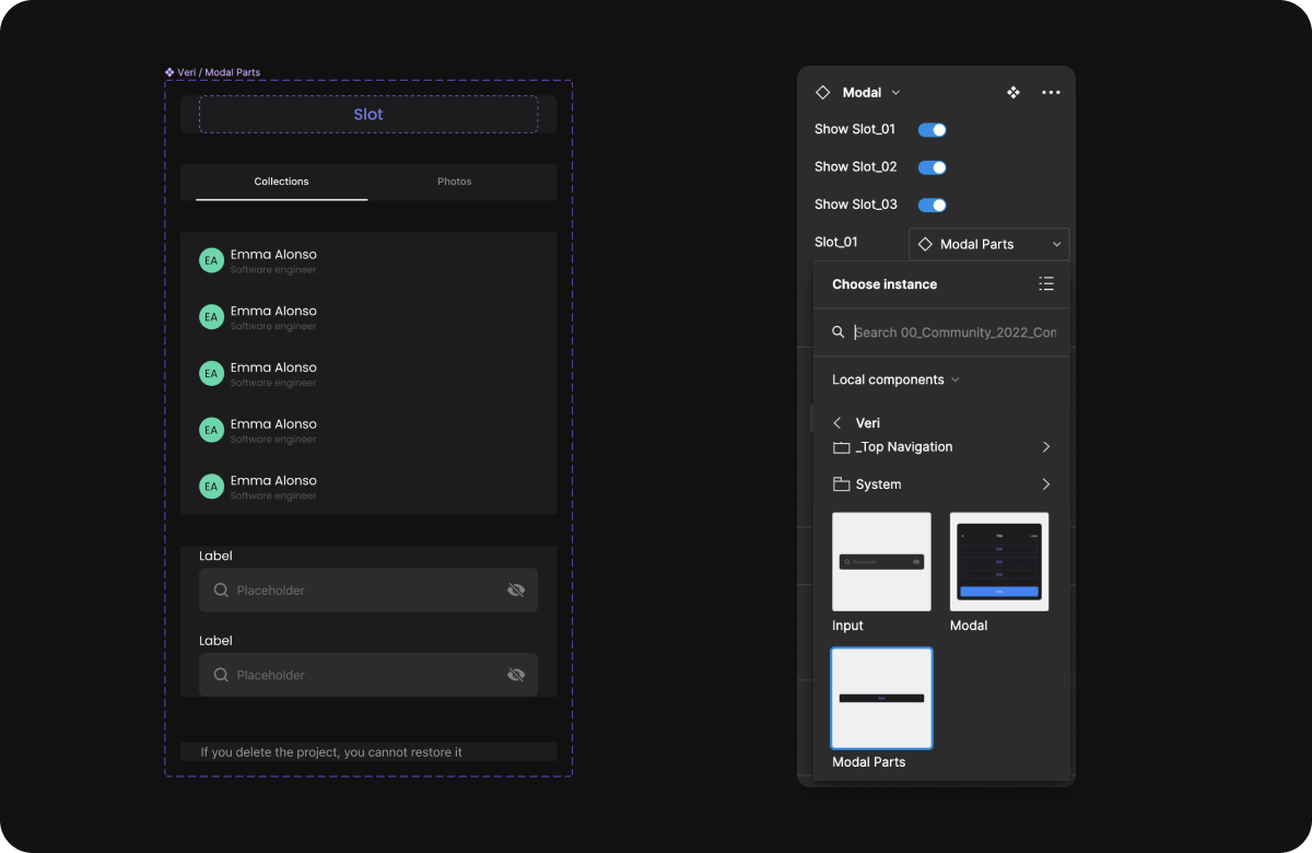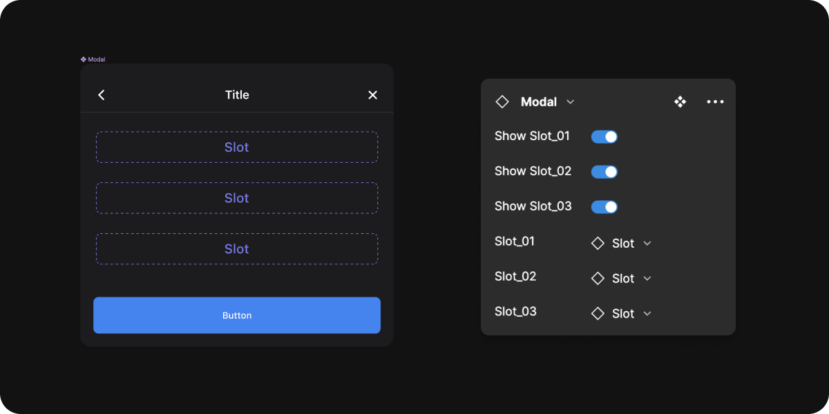 이제 만들어놓은 모든 컴포넌트들을 하나로 합쳐 Auto Layout을 설정해주고 Modal이라는 컴포넌트를 만들어줍니다. 첫 번째 슬롯은 Inspecter 패널의 Layer 섹션에서 Show Slot_01이라는 Prop를 생성해주고 Instance 섹션에서는 Slot_01이라는 Prop를 생성해주면 첫 번째 Slot의 존재 여부와 무엇으로 구성할지를 설정할 수 있습니다.
