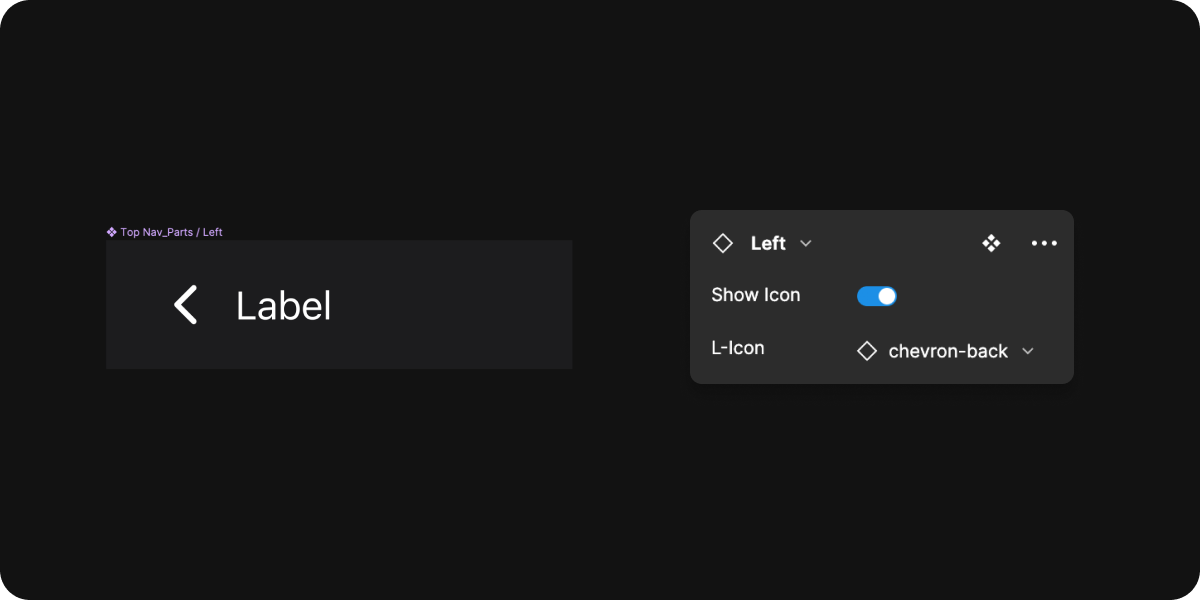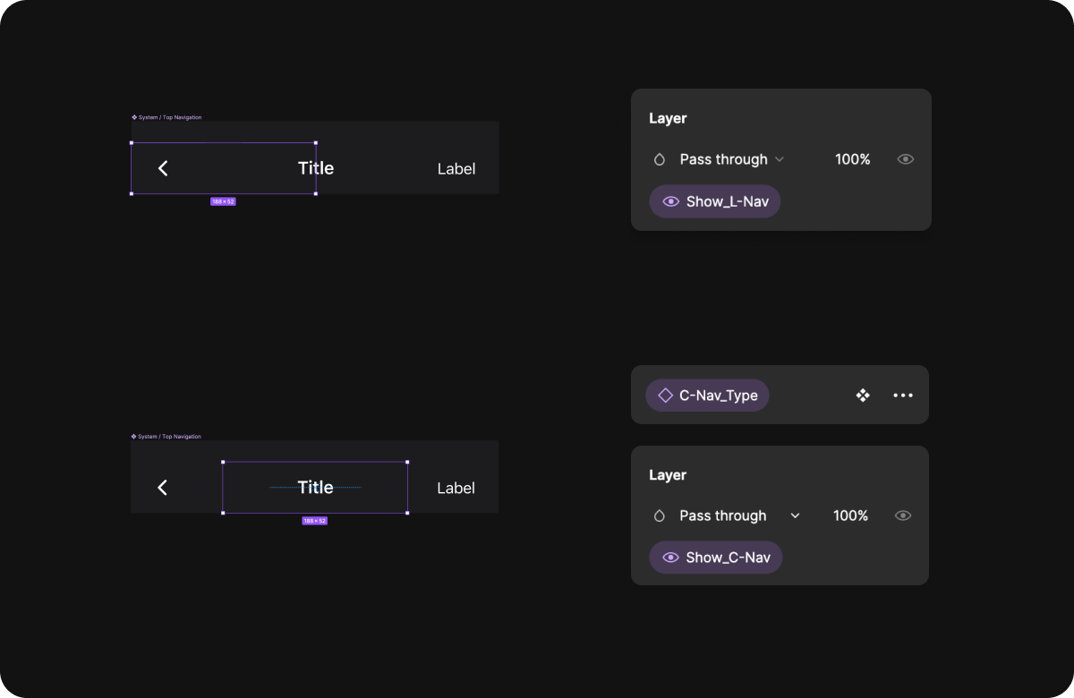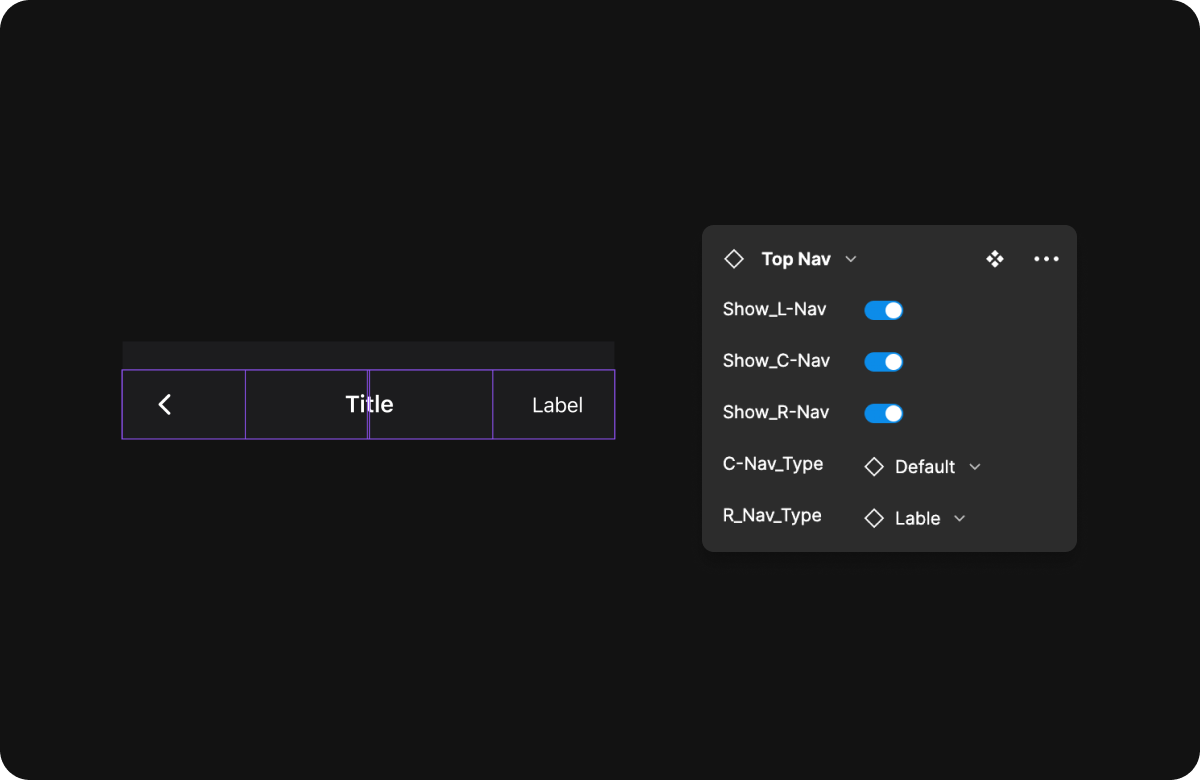 위의 이미지처럼 아이콘 옆에 라벨이 붙거나 아이콘이 두 개 붙는 유형이 생긴다면 Top Nav의 Inspector 패널은 너무 무거워지고 복잡한 설정을 해야 하는 경우가 생길 수 있습니다. 그래서 저는 타이틀을 변경하기 위해 중첩 컨포넌트까지 타고 들어가 야한 번거로움이 있더라도 추후 확장이 용의 하게끔 중첩 컴포넌트를 활용하여 제작한 것입니다.