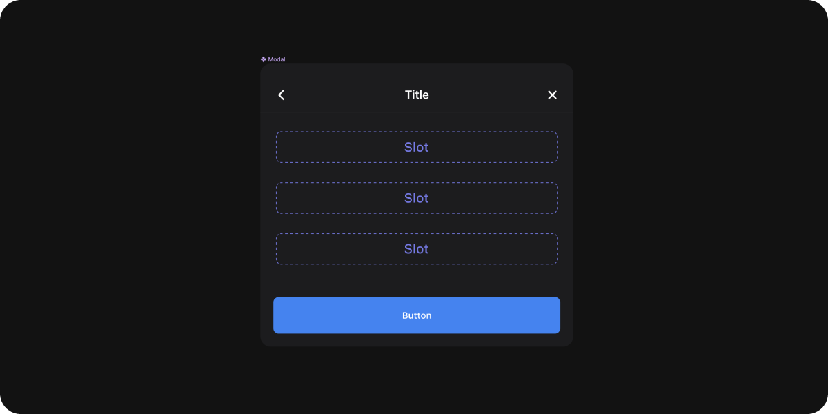 구조를 파악했다면 어떻게 구성할지를 큰 틀을 구성해야 합니다. 위의 이미지처럼 헤더와 버튼을 별도의 컴포넌트로 만들고 이를 중첩 컴포넌트로 추가한 다음 슬롯을 만들어 큰 모달 팝업을 구성해보도록 하겠습니다. 이처럼 제작을 하면 두 가지 유형의 팝업 이외에도 여러 유형의 팝업을 커버할 수 있고 혹시 다른 콘텐츠 유형이 추가되어도 콘텐츠 유형만 별도로 추가할 수 있어 유지보수가 매우 용의 하다는 장점을 가질 수 있습니다.
