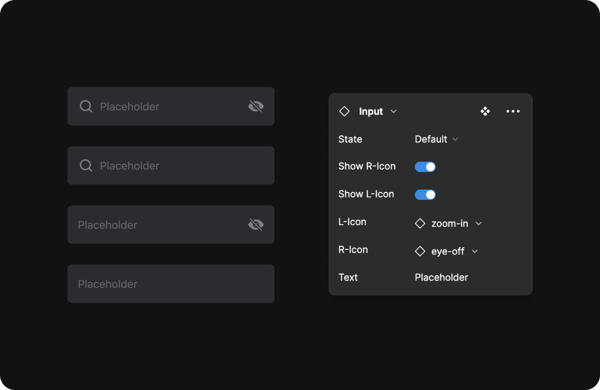 각 유형을 모두 만들기보다는 왼쪽과 오른쪽에 아이콘을 모두 포함하고 Layer 섹션에서 Prop 기능을 설정한 뒤 텍스트를 입력하는 Placeholder는 수평은 Fill, 수직은 Fixed로 설정하여 Auto Layout을 설정해줍니다. 이렇게 구성을 하면 좌우에 아이콘이 없을 때 Placeholder의 크기가 지정한 Padding 안에서 알맞게 조절이 되는 효과를 얻을 수 있습니다.