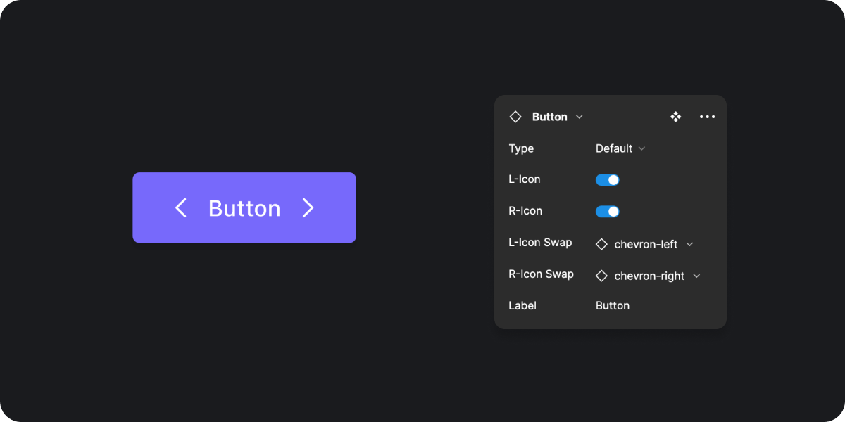 위의 이미지는 인스턴스 컴포넌트에서 보는 화면이며 Variants(Type)로 유형을 설정하고 Boolean(토글 버튼)으로 아이콘 유무를 변경하여 보다 빠르게 다양한 성격의 버튼을 구성할 수 있고 버튼을 고정된 크기로 제작하고 싶으면 오토 레이아웃을 적용하지 않으면 되고 아이콘 유무에 따라 크기를 제어하고 싶으면 오토 레이아웃을 설정하시면 됩니다.