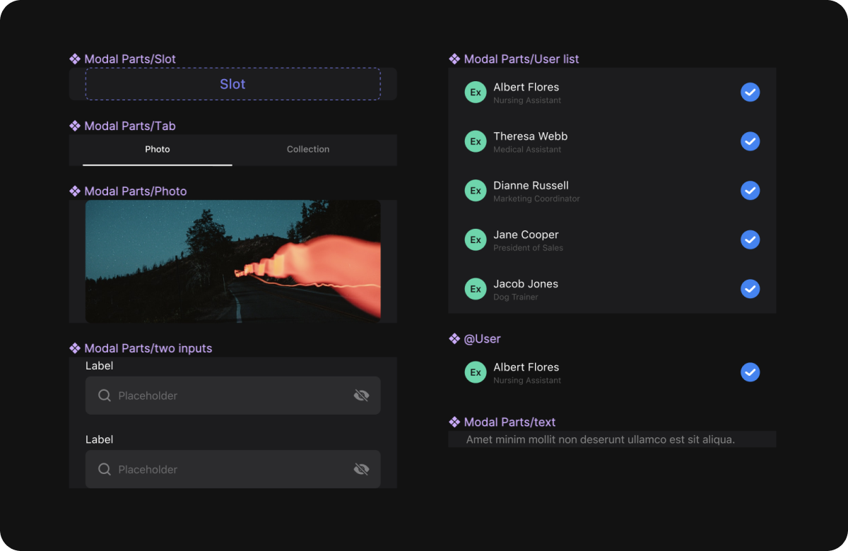 저는 이런 것들을 만들 때 보통 위의 이미지처럼 ‘컴포넌트 이름_Parts’라는 명칭을 붙여 해당 컴포넌트의 부품처럼 활용할 수 있게 제작합니다. 이렇게 별도의 컴포넌트로 제작하게 되면 나중에 새로운 유형이 콘텐츠가 추가되어도 팝업을 새로 만드는 게 아닌 Parts를 하나 더 만들어 여러 유형을 제작할 수 있기 때문에 유지보수가 용의 하다는 장점이 있습니다.