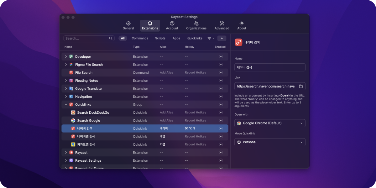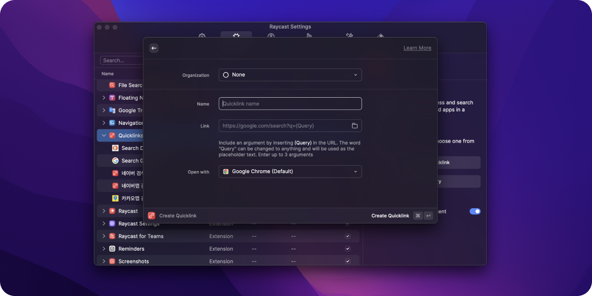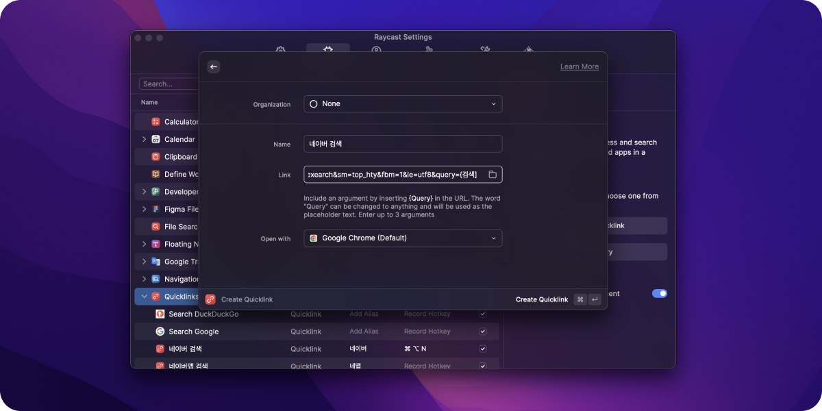 해외에서 Raycast가 각광받고 있는 이유는 대부분의 기능이 무료라는 점도 있지만 Alfred보다 직관적이고 심플한 디자인을 말하고 있습니다. 특히 Quick Link의 쿼리를 표현하는 즉 조건값을 입력하는 부분에서 디자인 퀄리티 차이를 느낄 수 있습니다.