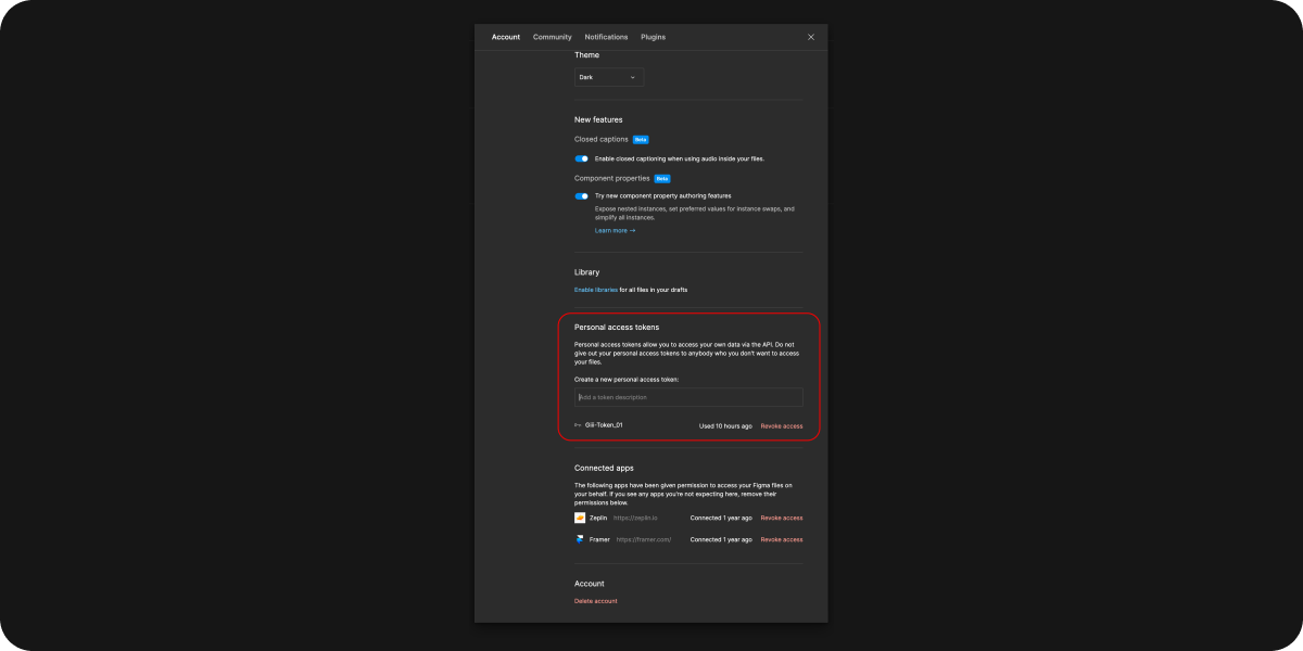 Personal Access Token은 피그마의 진입 화면에서 우측 상단의 프로필의 Setting을 클릭하면 하단의 이미지 같은 창이 실행되는데 여기서 원하는 Token 이름을 입력하시면 일련의 문자들이 나오는데 이걸 복사해서 붙여 넣어주시면 됩니다.