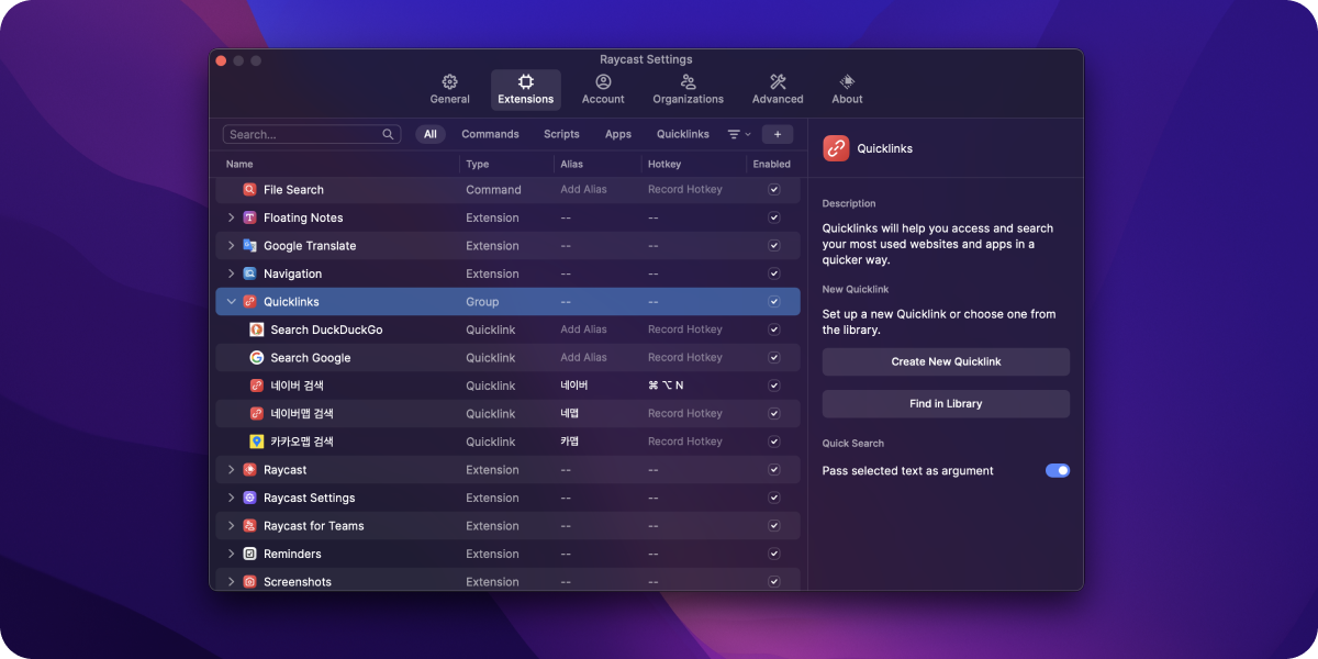 일단 하단의 이미지처럼 Setting > Extentsions를 들어가서 Quicklinks를 클릭하고 프리셋을 사용하고 싶으면 Find in Library를 클릭하면 되고 저희는 Create New Quicklink를 클릭해주시면 됩니다.