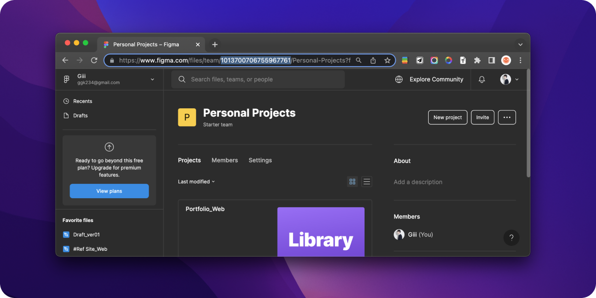 다음은 Team ID를 입력해야 하는데 브라우저를 통해서 피그마를 접속하시고 자신의 Team을 클릭해주면 주소창이 아래 이미지와 같이 표시될 것입니다. 그러면 주소창에 /team/ 옆에 있는 숫자를 Team ID에 넣어주시면 됩니다.