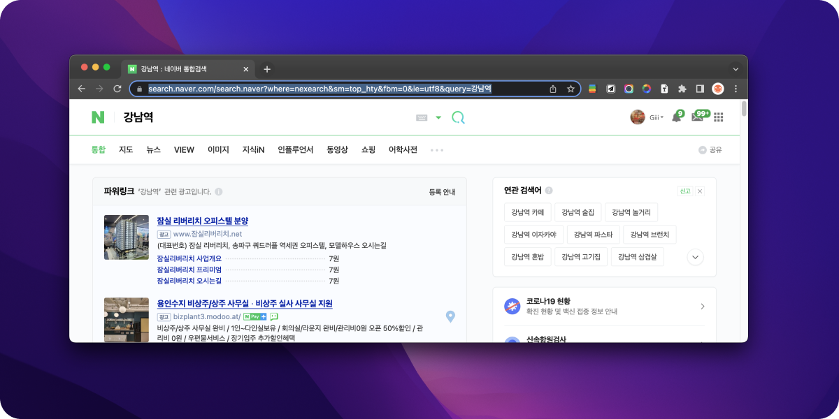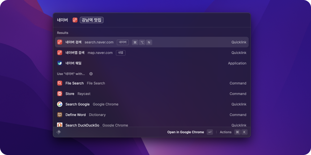모든 설정이 끝났으니 하단의 이미지처럼 단축키로 Raycast를 실행하고 설정한 네이버(설정한 별명)를 입력한 후 스페이스바를 누르면 쿼리창(검색할 텍스트)으로 커서가 들어가는데 거기에 강남역 맛집을 입력하시면 알아서 크롬을 열어주고 알아서 네이버를 접속한 뒤 강남역 맛집을 검색한 화면이 나올 것입니다.