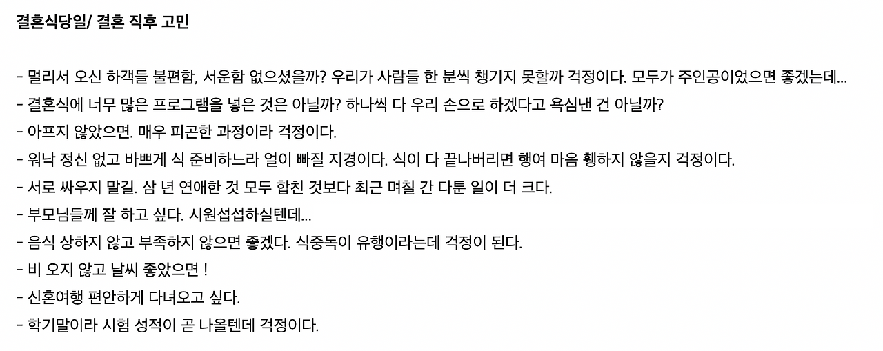 얼마 전 메일 정리를 하다 결혼식을 준비하며 남편이 보냈던 메일을 발견했다. 주례 선생님이 결혼을 앞두고 고민거리가 있으면 알려달라고 말씀하셨던 것에 답하는 메일이었다. 날짜를 보니 결혼식 5일 전.
