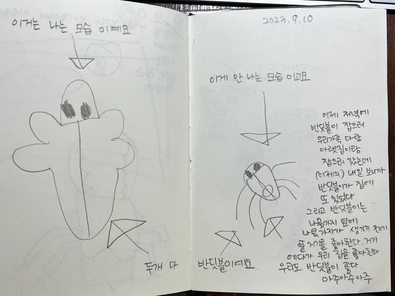 “어제 저녁에 반딧불이 잡으러 우리 가족 다랑 아랫집이랑 잡으러 갔는데 내일 보니까 반딧불이가 집에 또 있었다. 그리고 반딧불이는 나뭇가지 옆에 나뭇가지가 생기기 전에 풀 거기를 좋아한다. 거기에다가 우리 집을 좋아한다. ‘우리’도 반딧불이 좋다. 아주아주아주.” (23.9.10)