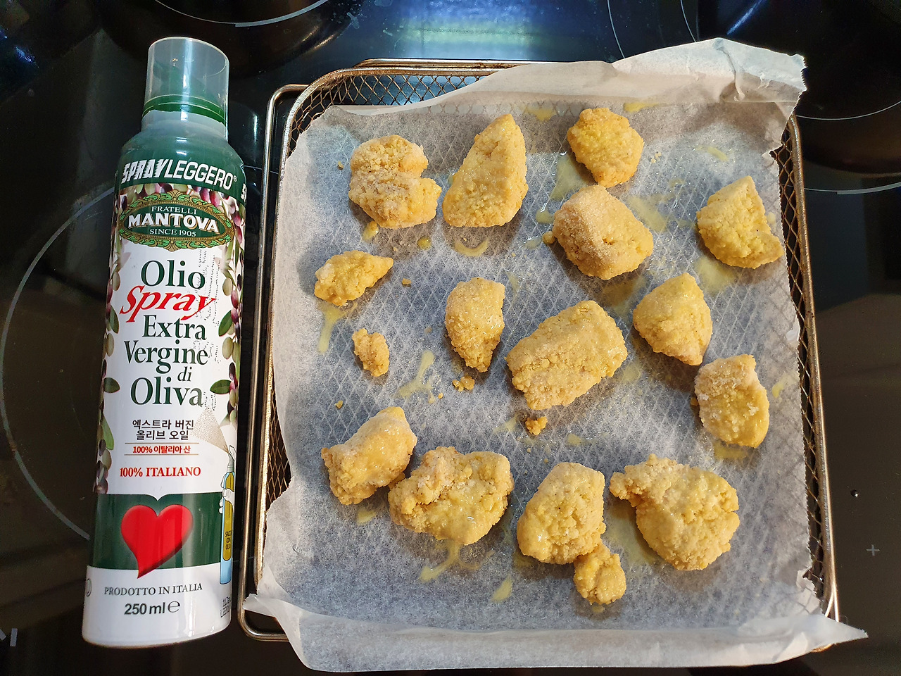 1-1) 냉동 치킨을 해동 없이 에어 프라이기에 올리브유를 표면에 묻혀주고 180도에서 13분간 조리한다. 설명서에는 7분쯤 한번 뒤집어주라고 하는데, 귀찮아서 그냥 먹었지만 괜찮았다.