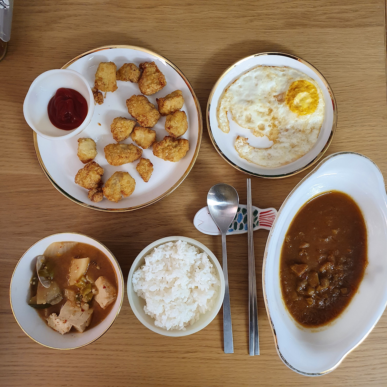 즉석 치킨, 즉석카레, 계란 두 알, 올리브유, 김치