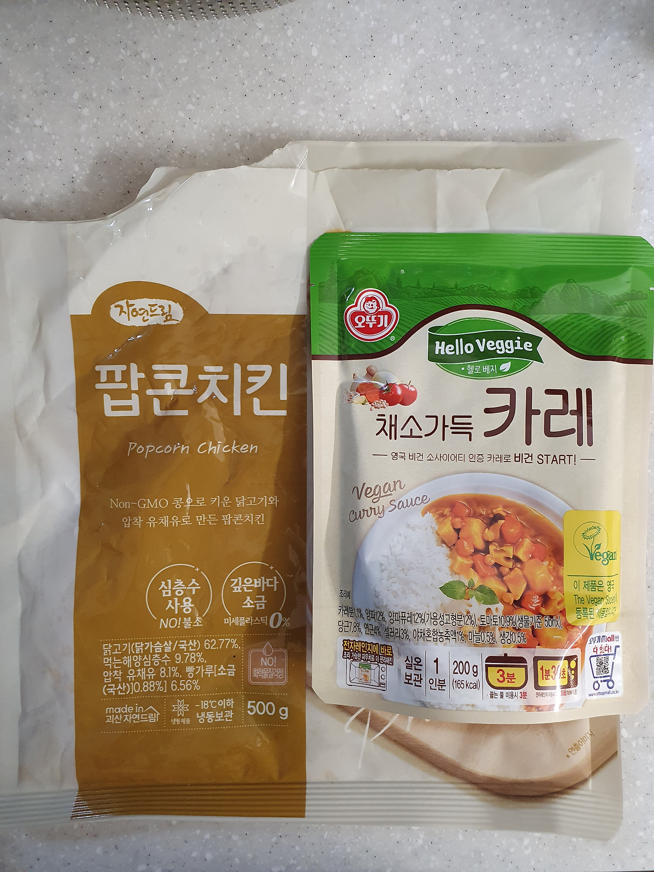 (광고 X) 자연드림 팝콘치킨은 예전에 먹었을 때 맛이 있었고, 오뚜기 채소 가득 카레는 처음 먹어보지만... 크게 무리가 될 것 같지는 않으니 일단 조리 시작!
