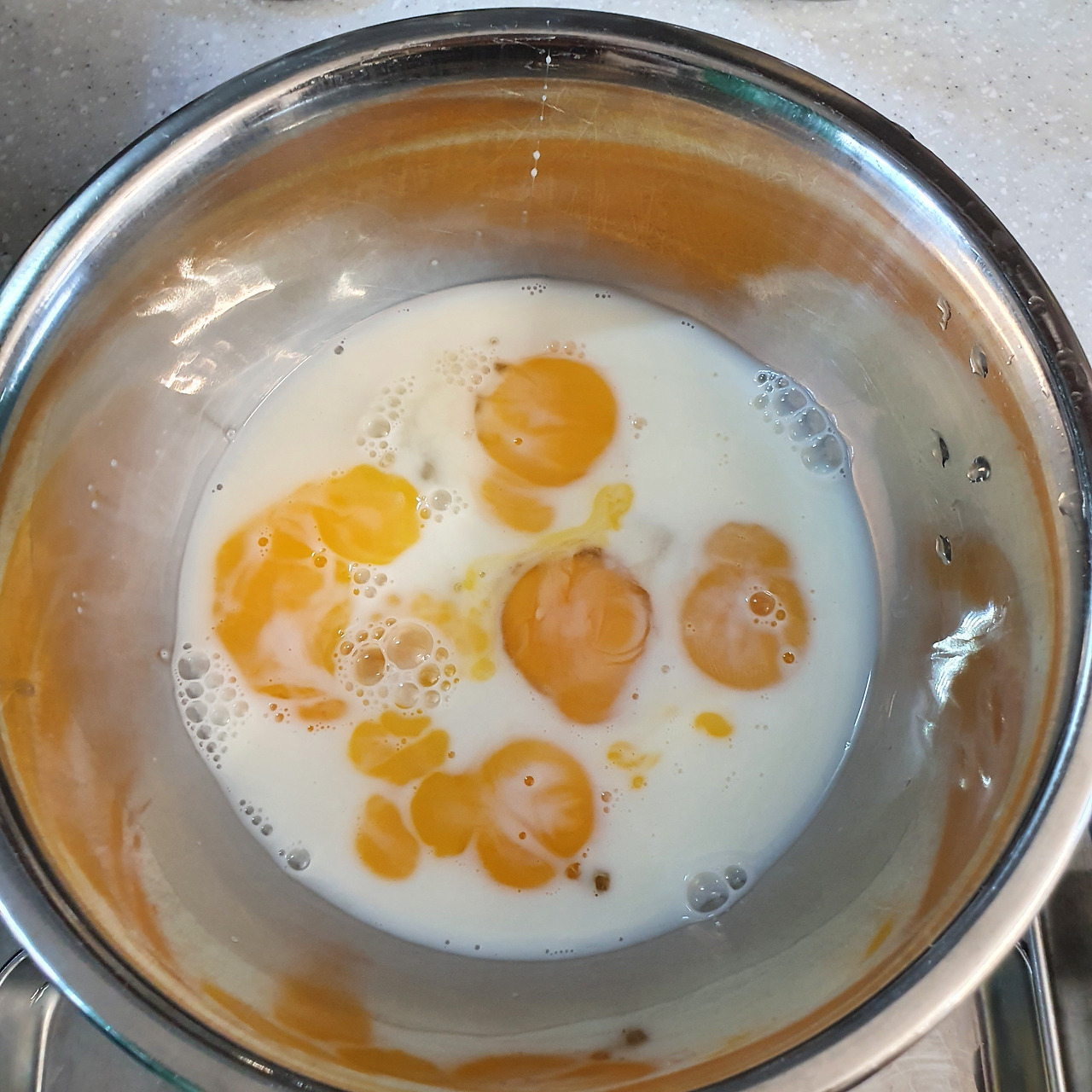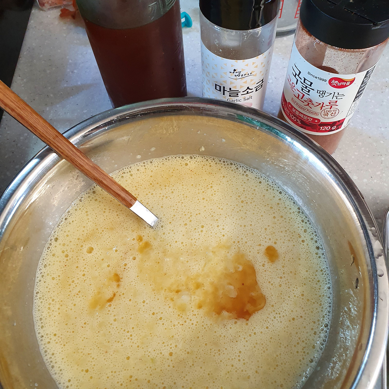 4) 부침개를 조금 부드럽게 하기 위해 계란물에 우유를 조금(50 ml 정도?) 넣는다. 우유를 넣으면 조금 더 고소하고 부드러운 맛이 나는데, 너무 많이 넣으면 부침개가 쉽게 찢어지고 바스러지니 적당량을 잘 넣는 것이 중요하다.