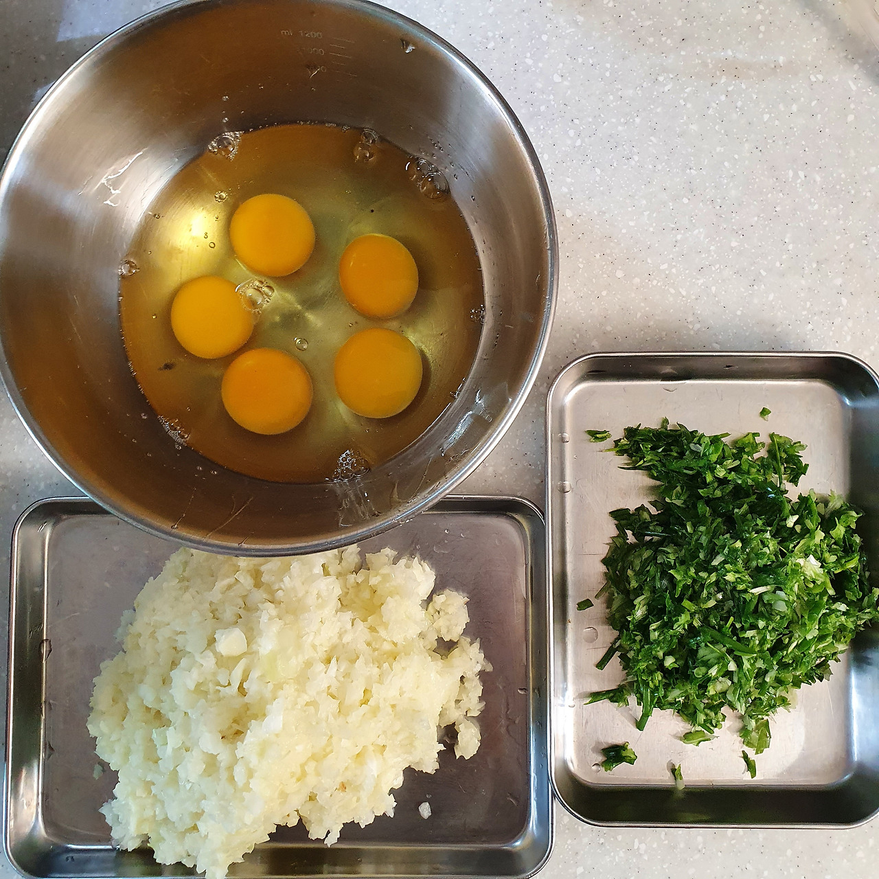 3) 계란을 모두 풀고 다진 재료들을 준비한다.