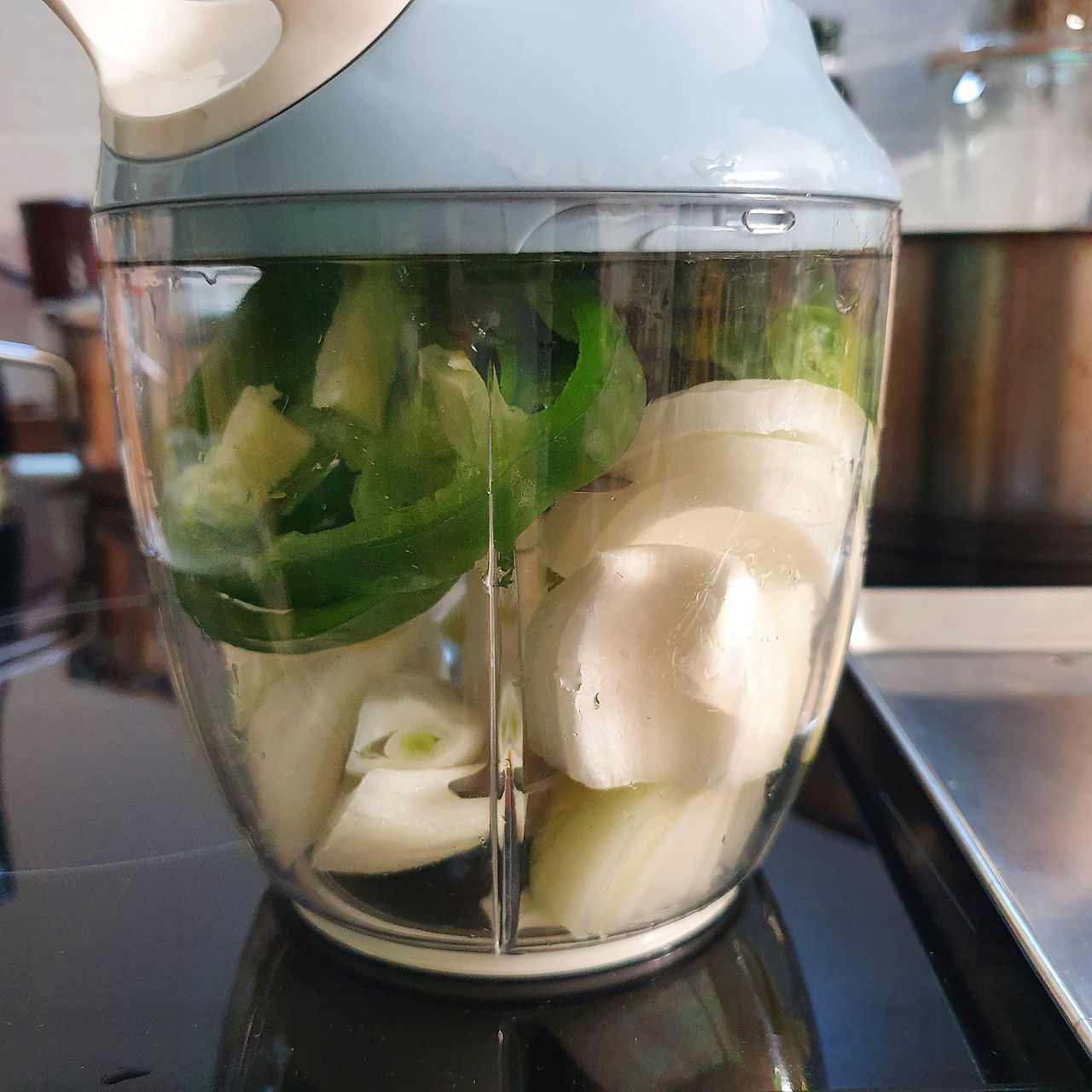 1) 살짝 볶을 재료인 피망과 양파를 다지기를 이용해서 잘게 다진다. 이 재료는 나중에 먹기 직전에 또띠아에 바로 넣을 재료이다.