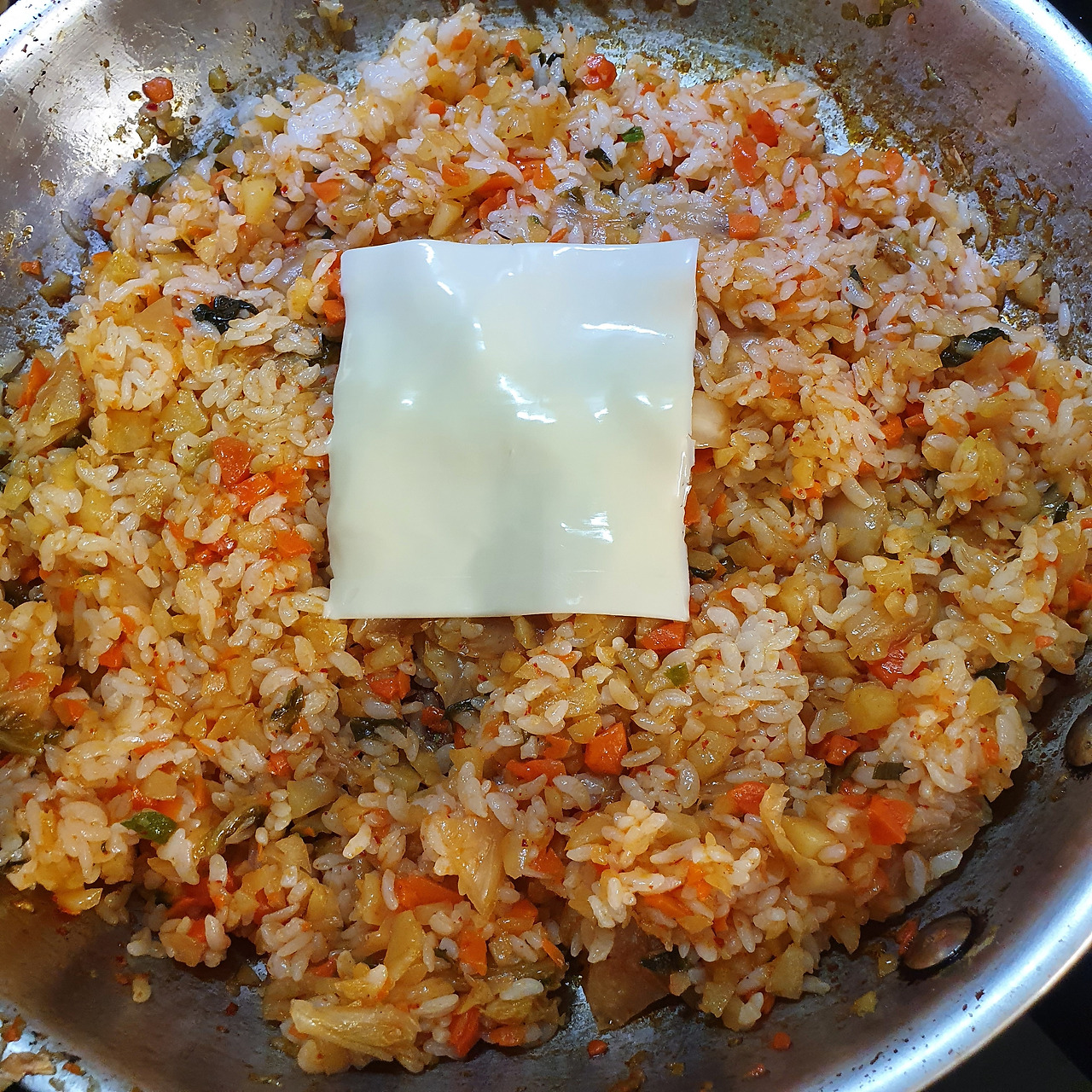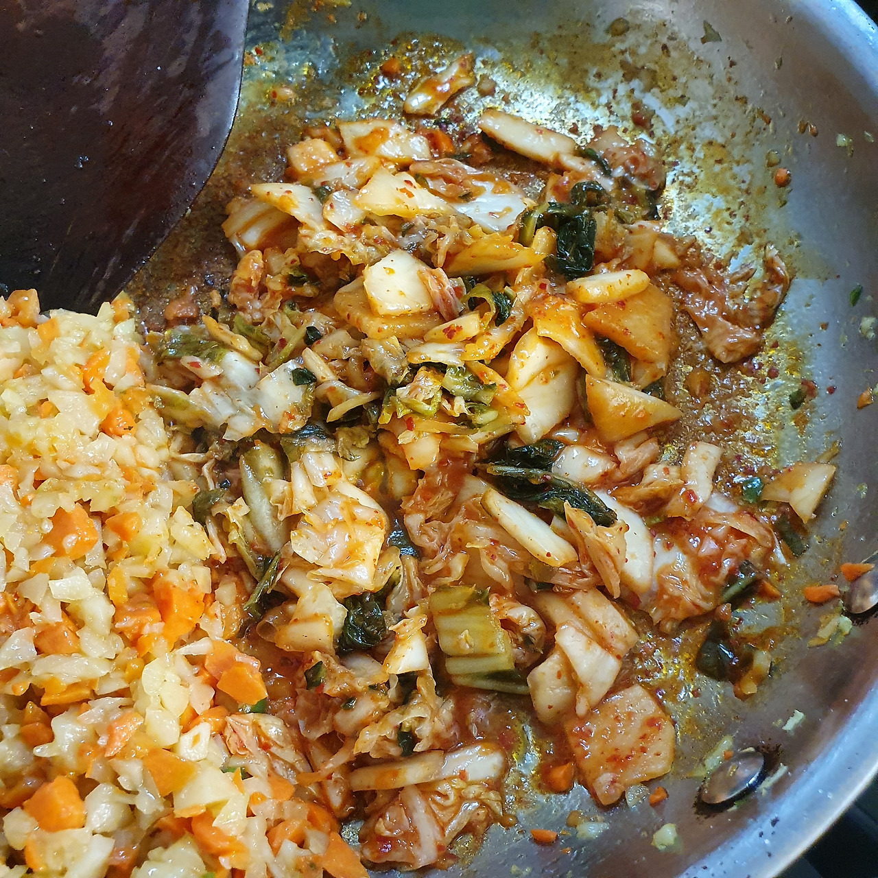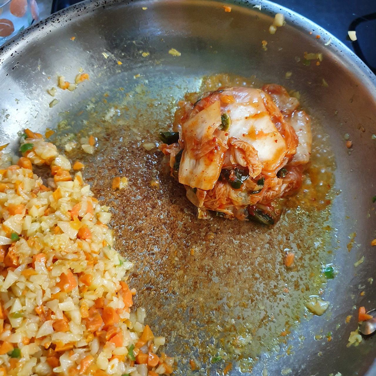 7-1) 밥에 야채와 김치 양념이 골고루 섞일 때까지 잘 볶는다.