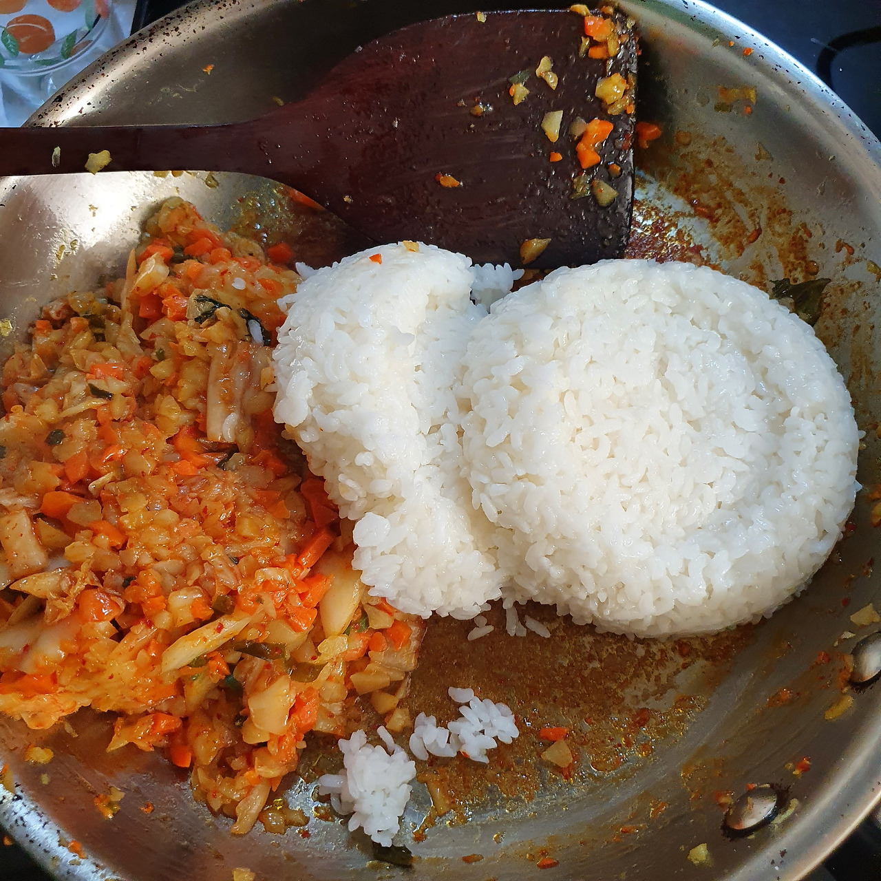 7) 김치까지 잘 볶아지면, 밥을 적당량 넣는다.