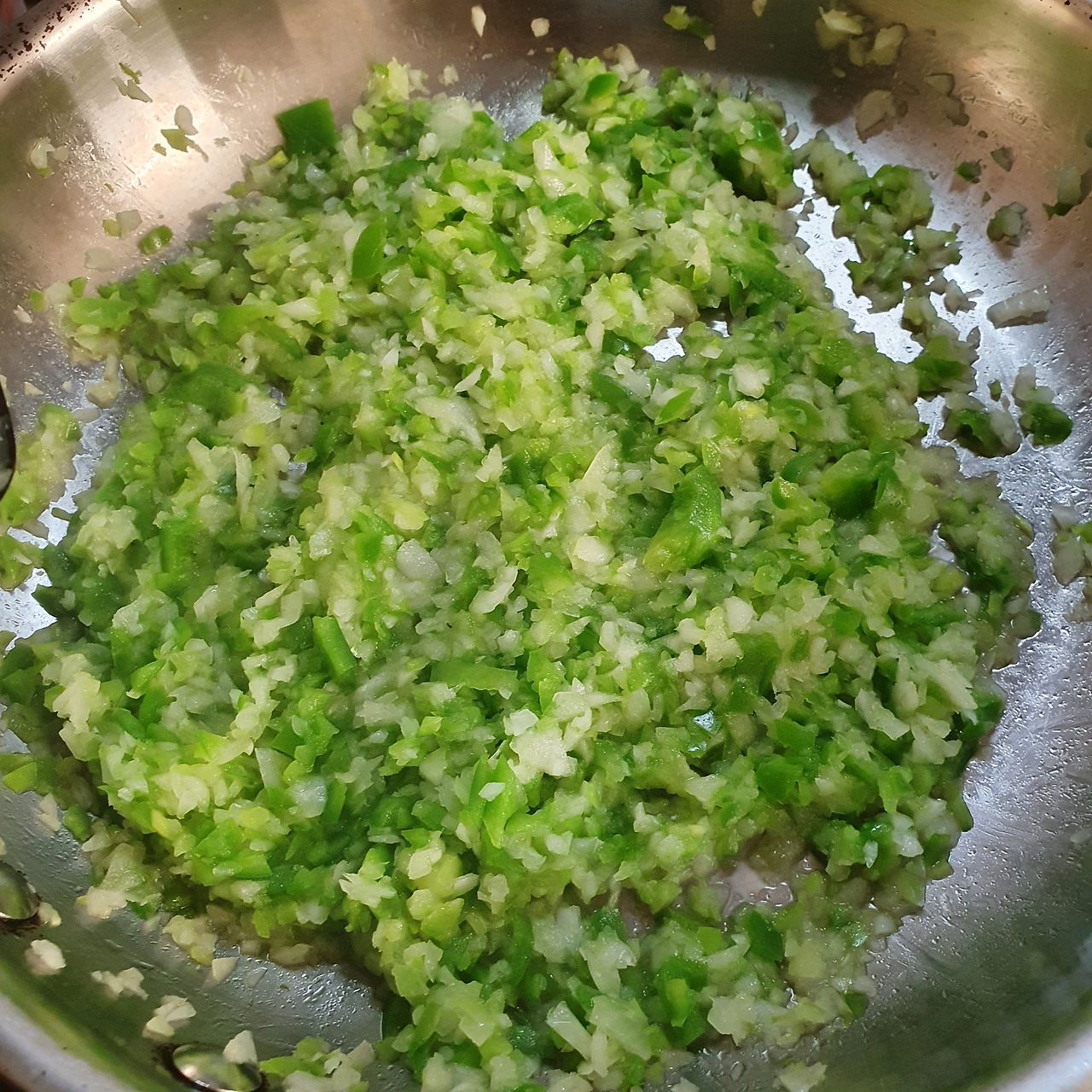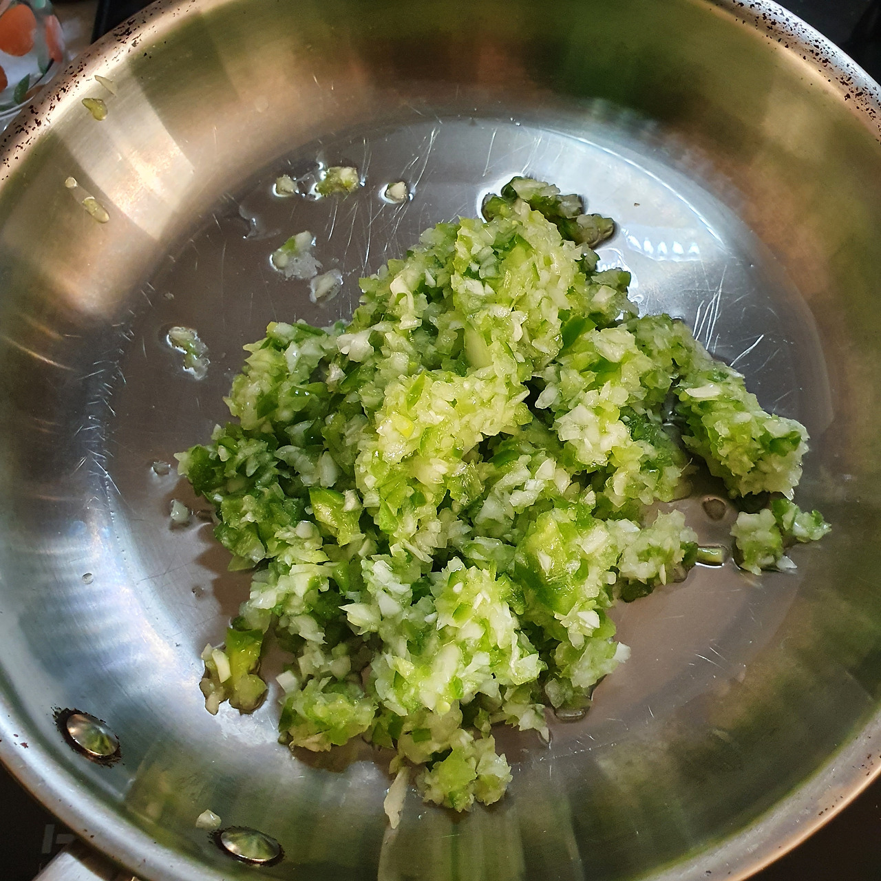 4) 기름을 두르고 피망과 양파를 기분 좋은 향이 올라올 만큼 살짝 볶는다. 양파의 매운 향이 날아갈 정도면 충분하다. 양파의 알싸한 맛이 좋은 사람은 조금 덜 볶아도 좋다.
