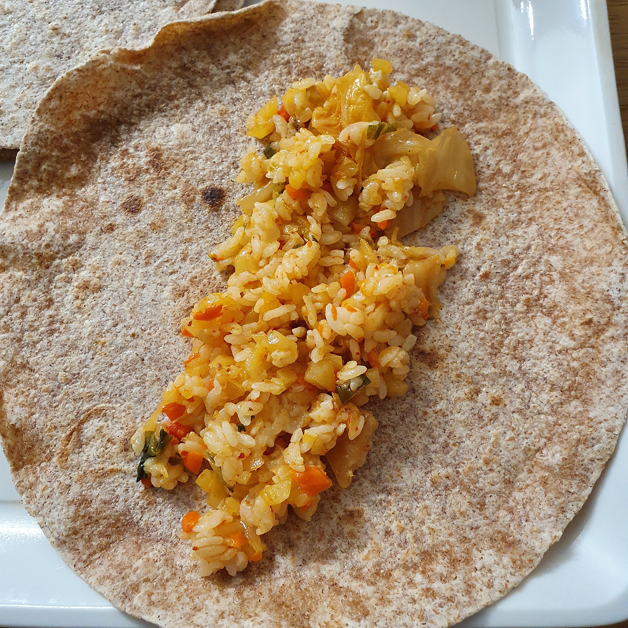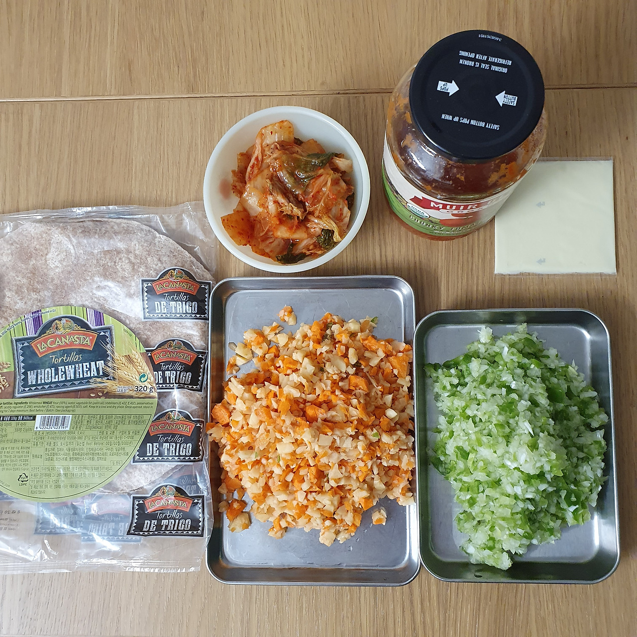 오늘은 집에 있는 재료로 어떤 저녁을 먹을까 고민했다. 오래전에 사놓은 또띠아가 있었고, 각종 야채들이 조금 있었다. 또띠아를 빨리 먹어치우고 싶어 속을 어떻게 만들면 좋을까 고민을 했다. 얼마 전에 사 온 김치가 맛있어서 야채와 함께 볶음밥 같이 만들어 속을 채워 먹으면 맛있을 것 같았다.