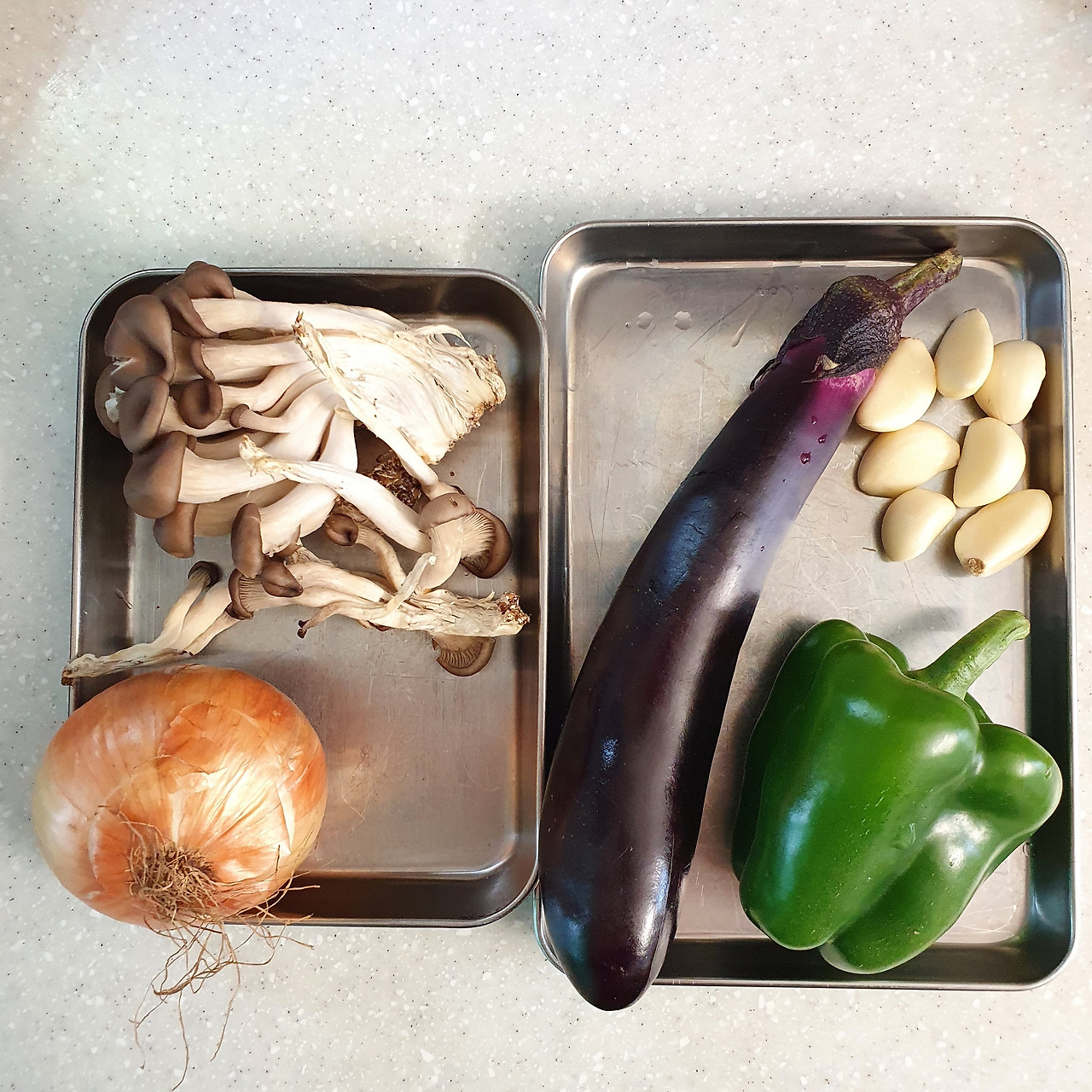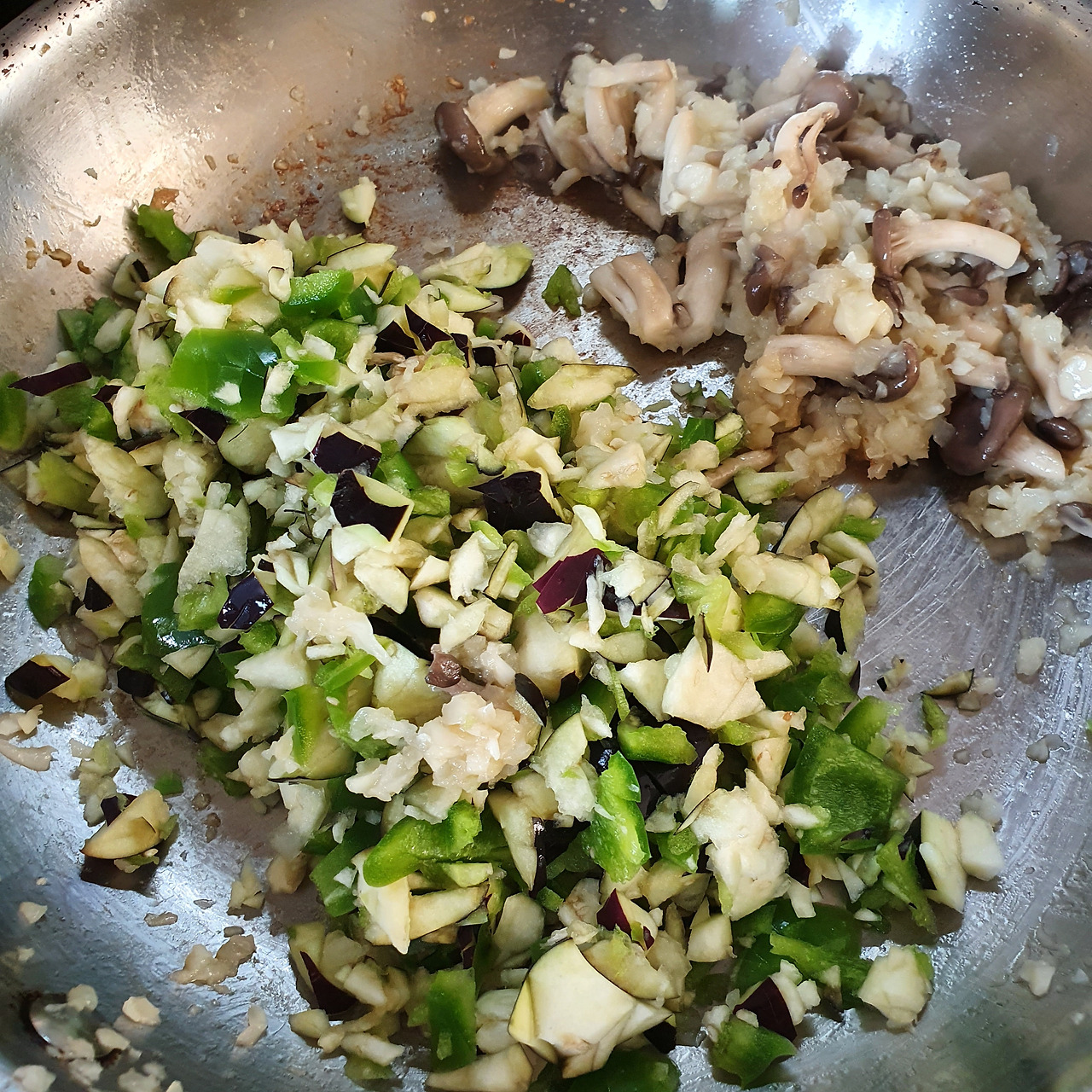 4) 버섯이 적당히 익은 것 같으면, 가지와 피망 투하!