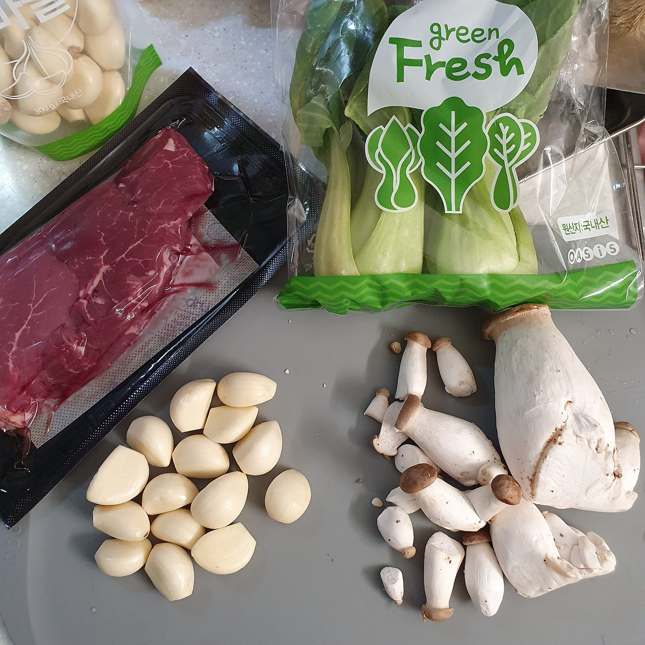 연말이기도 하고, 분위기도 내볼 겸 오늘은 스테이크를 요리해주기로 했다. 아내가 좋아하는 청경채 볶음과 함께 안심 스테이크를 만들어주었다. 그리고 아내가 좋아하는 감자 같은 마늘 볶음을 한가득 해주었다.