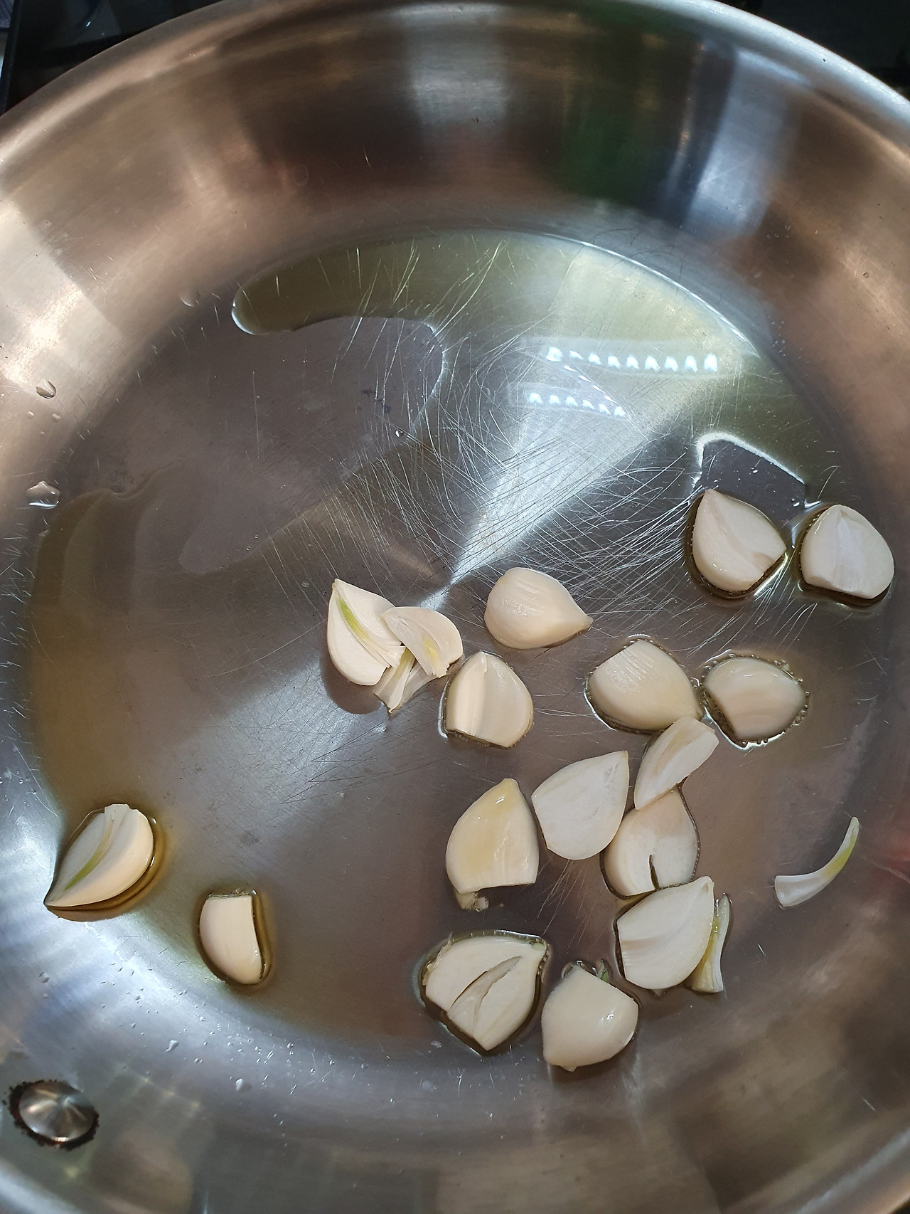 1) 프라이팬에 올리브유를 두르고 편으로 썬 마늘을 잘 볶아준다.