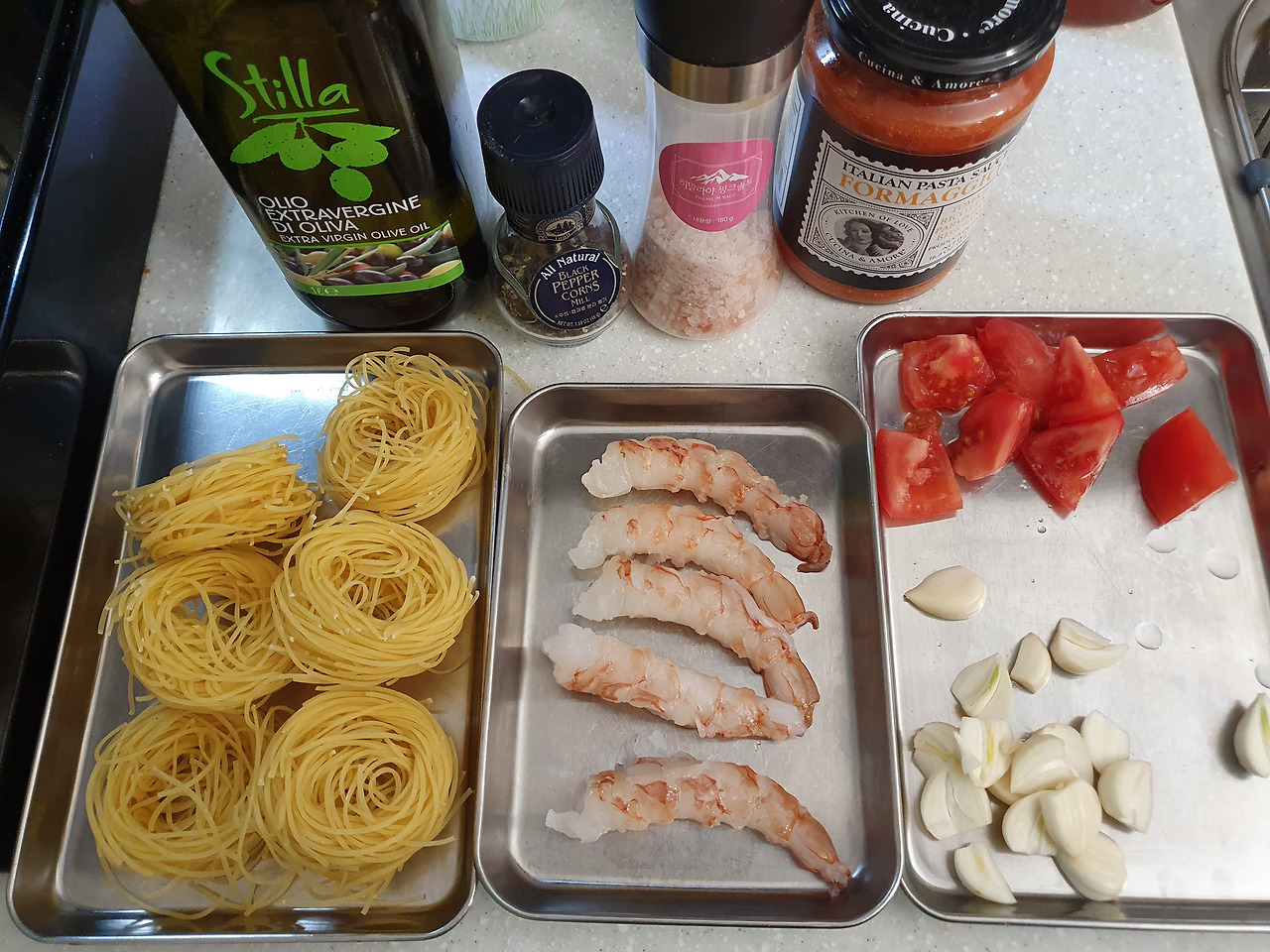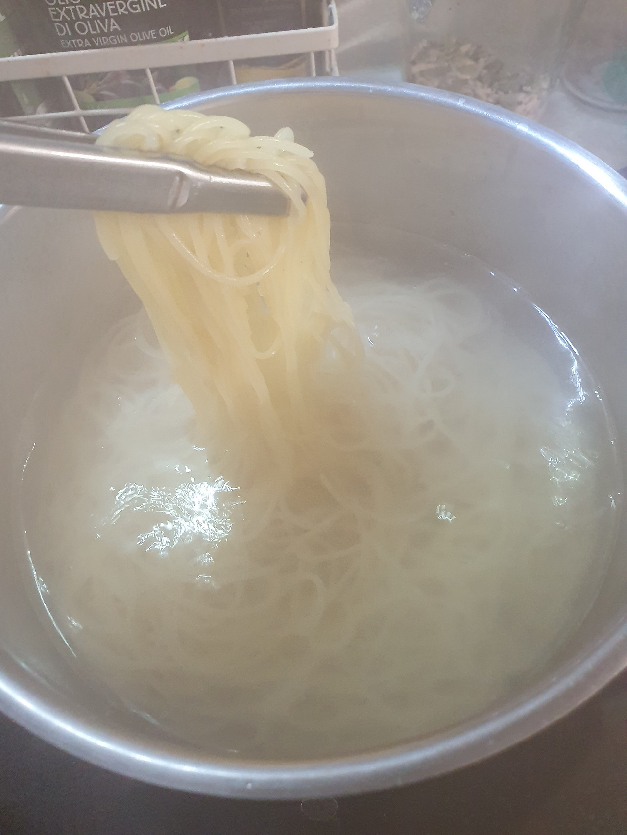 3) 마늘과 새우를 굽는 동안, 파스타 면을 삶는다.
