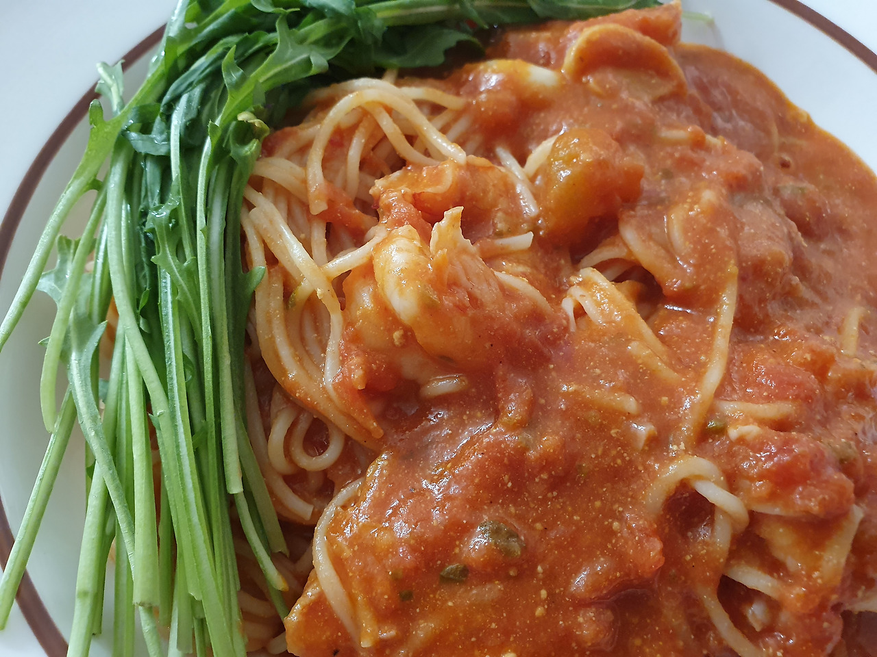 퇴근하고 나서 하게 되는 고민은... 저녁메뉴이다. 누군가 건강하고 맛있고 다채로운 식단표를 잘 짜주고, 그 요리 재료들을 잘 손질해 주고, (요리까지 해주면 더 좋고...), 가격도 저렴한 서비스가 있다면... 우리가 이런 고민을 매일 하지 않아도 될 텐데라는 망상을 잠시 해본다. 특별히 생각나는 요리가 없다면, 꽤나 간편한? 파스타를 먹는 것이 좋다. 뒷정리가 번거롭긴 해도 라면보다 약간? 더 복잡한 수준이지만 더 멋지고 맛있는 요리를 먹을 수 있으니 말이다. 아내는 특히나 구운 새우와 파스타를 좋아하므로 새우 파스타를 하기로 했다. 마침 나는 안 먹지만 아내는 매우 좋아하는 루꼴라도 있어서 루꼴라 파스타를 하기로 했다.
