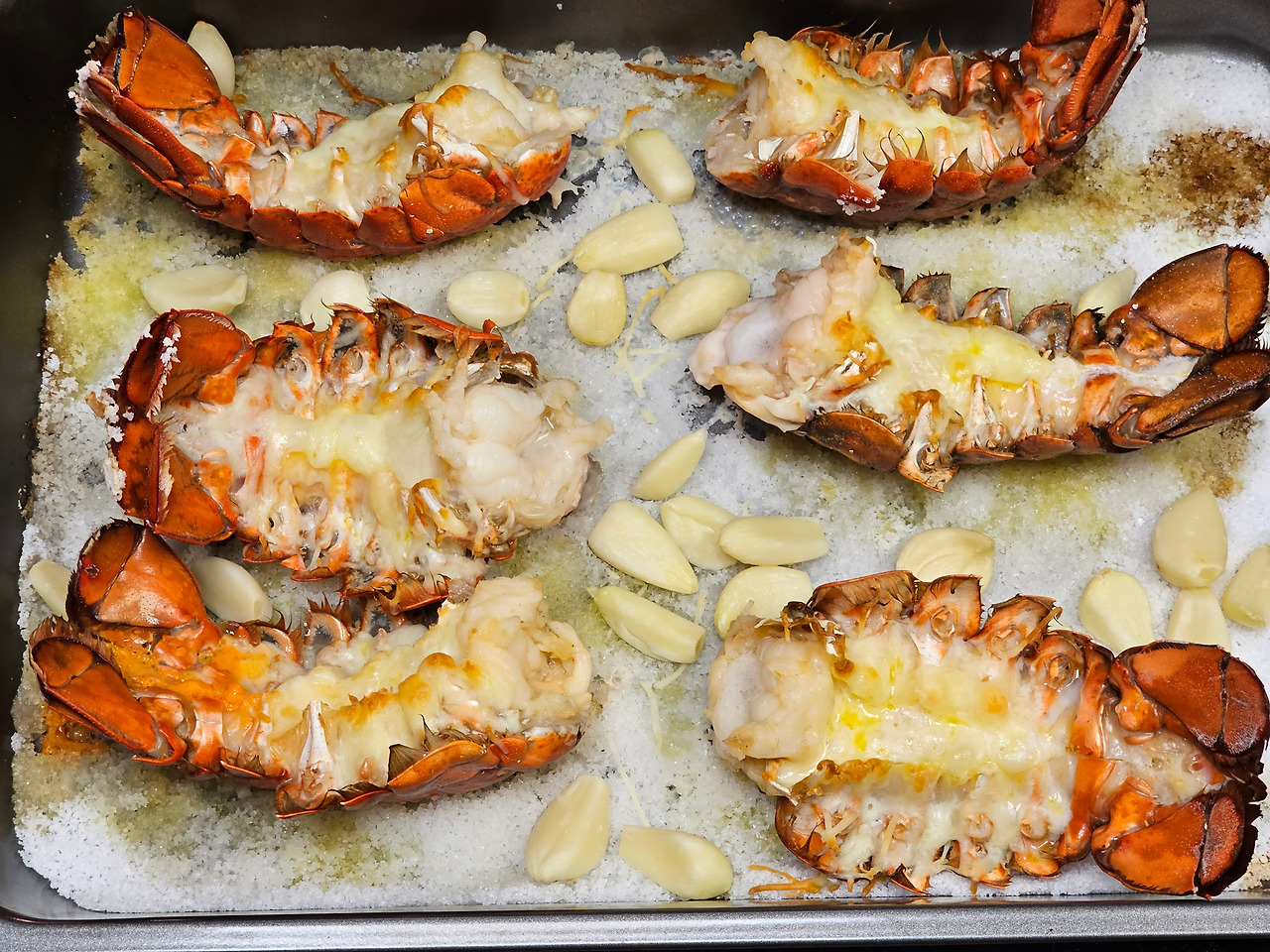 1) 오븐팬에 굵은소금을 잘 깔아준다. 랍스터가 바닥에 붙어 타지 않게 하기 위함이다.